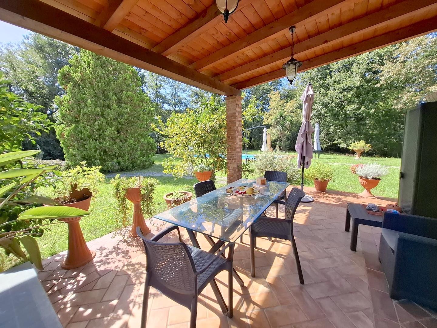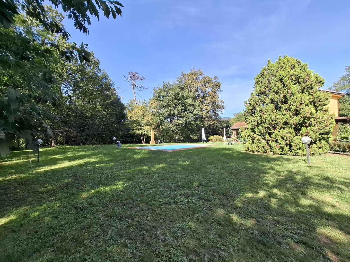 Esternamente un parco di quasi 6.000mq con posti auto coperti e grande piscina con doccia esterna, piccolo boschetto privato.