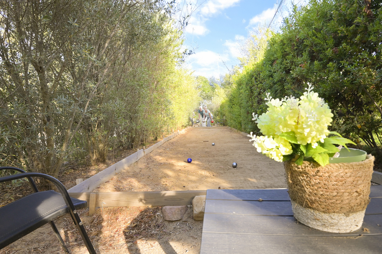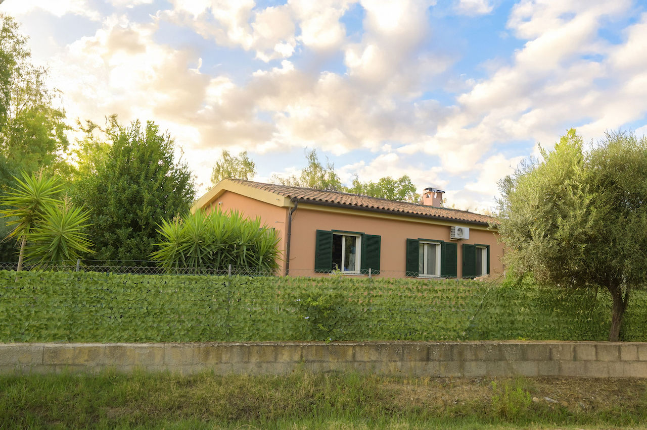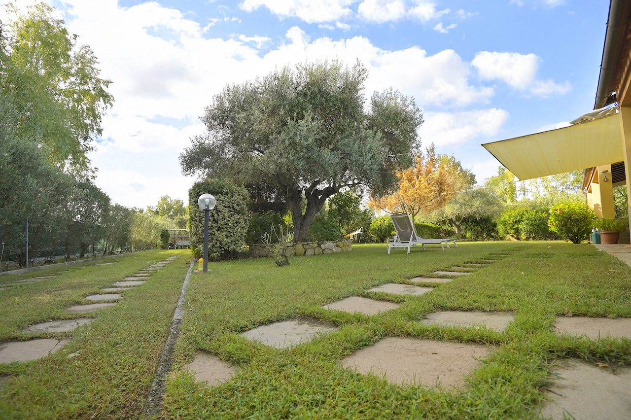 Esterno e giardino: l'immobile completamente circondato da prato verde, il terreno piantumato con olivi e vari tipi di piante da frutta, sono inoltre presenti un campo da bocce e un barbeque.