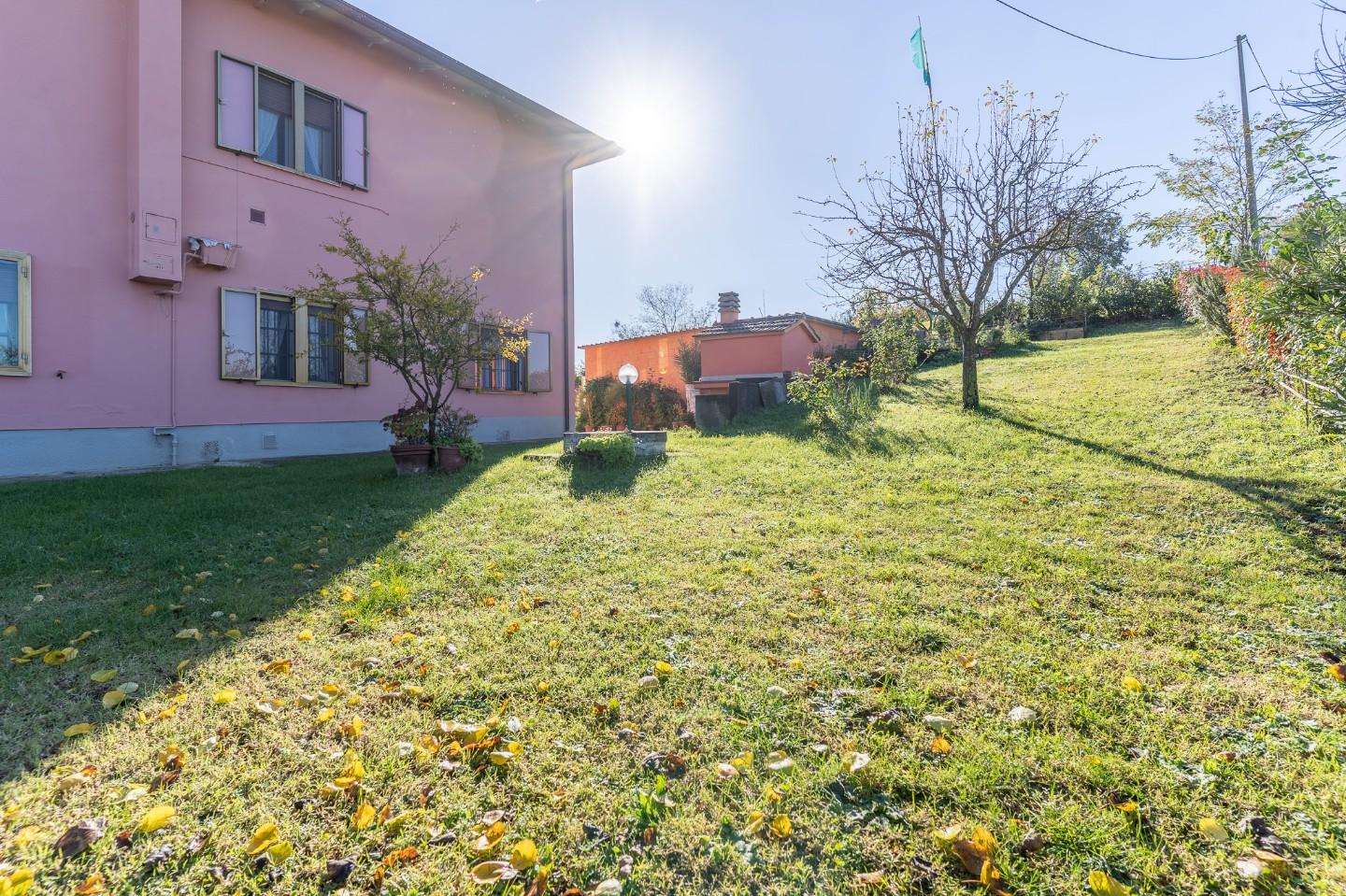 GARAGE E MAGAZZINO LIBERA SU QUATTRO LATI DUE APPARTAMENTI INDIPENDENTI GIARDINO DI CIRCA 2.300 MQ CON POZZO E GAZEBO GLI SPAZI: La superficie netta calpestabile di ogni appartamento è di circa 120 mq. La superficie commerciale complessiva (incluso il giardino, i garage e il magazzino) è di circa 450 mq. Il prezzo al mq è di circa 722 Euro. LE STANZE: APPARTAMENTO 1: Posto al piano terra con ingresso singolo (APE=F). L'appartamento ha una superficie netta di circa 120 mq È così composto: - Ingresso - Disimpegno - Cucina abitabile con stufa a legna - Soggiorno - Camera matrimoniale 1 - Camera matrimoniale 2 - Camera doppia - Bagno (con doccia e finestra) rifatto nel 2017 - Due garage (uno di circa 50 mq e l'altro di circa 20 mq) APPARTAMENTO 2: Posto al piano primo con accesso tramite scala esterna (APE=G). L'appartamento ha una superficie netta di circa 120 mq. È così composto: - Ingresso - Disimpegno - Cucina abitabile - Soggiorno - Camera matrimoniale 1 - Camera matrimoniale 2 - Camera doppia - Bagno (con vasca e finestra) - Magazzino di circa 50 mq Il giardino, con pozzo, forno e gazebo, è in comune alle due unità immobiliari.