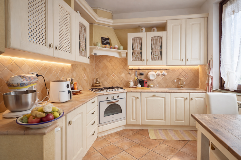Al piano terra si trovano ingresso, cucina, soggiorno, bagno e due camere, di cui una con accesso a terrazza.