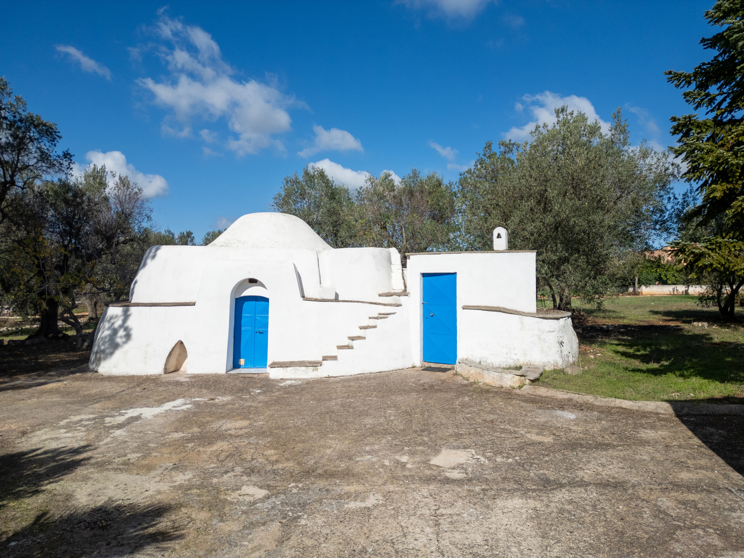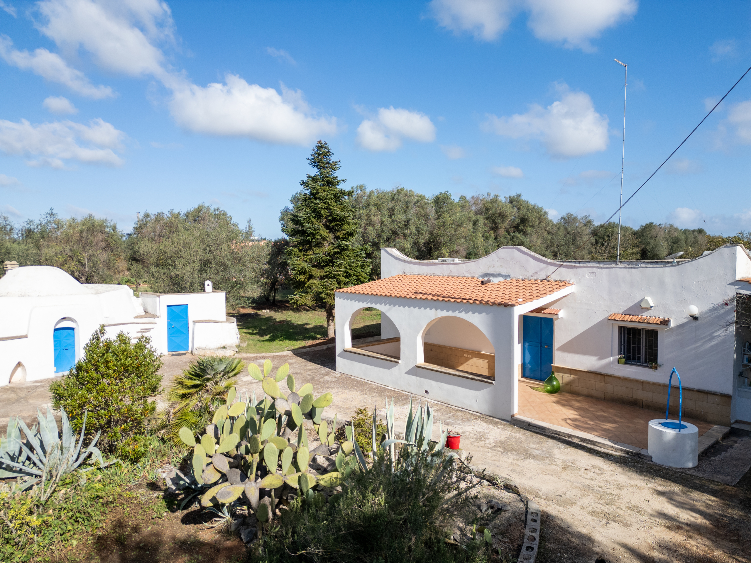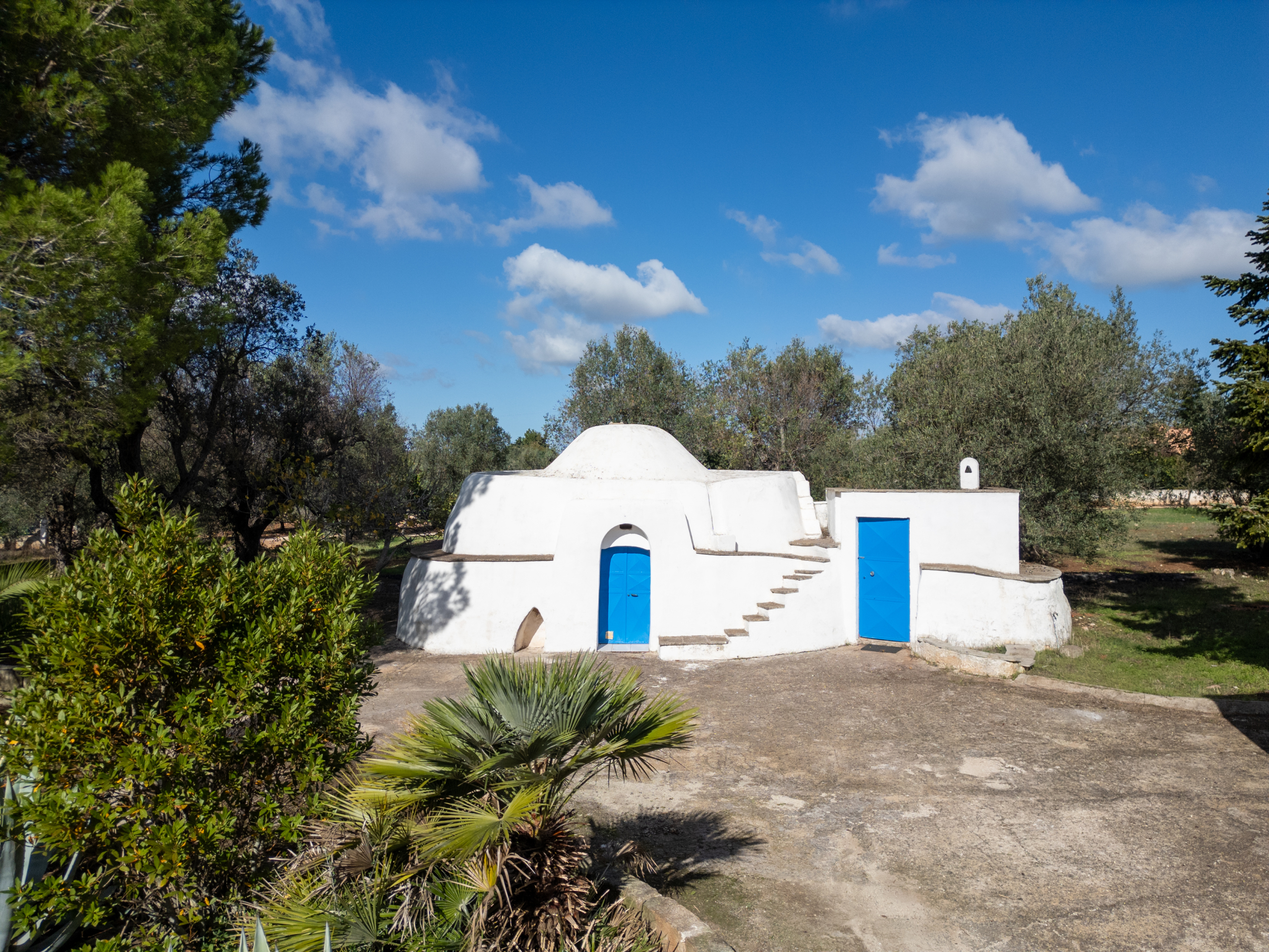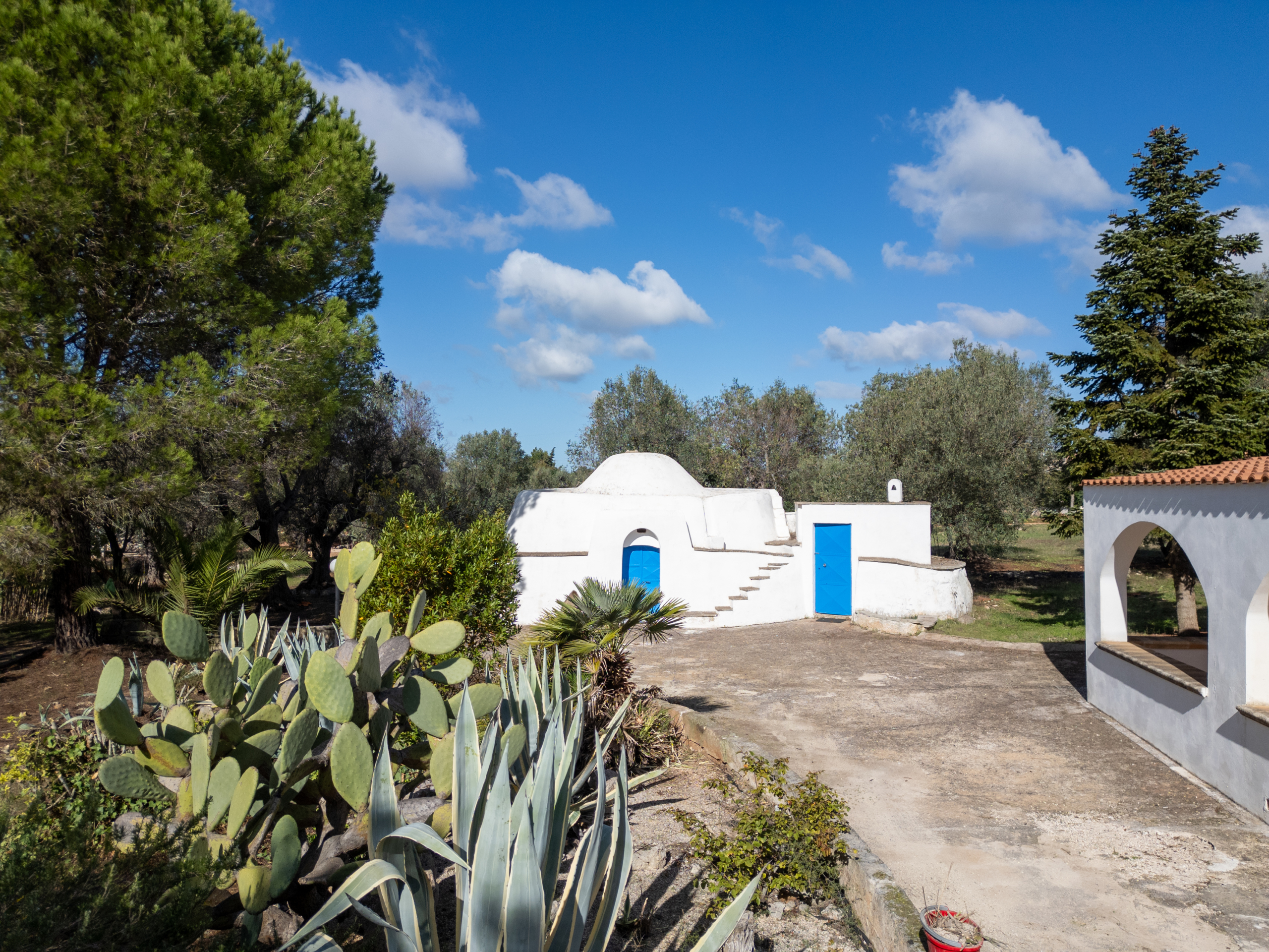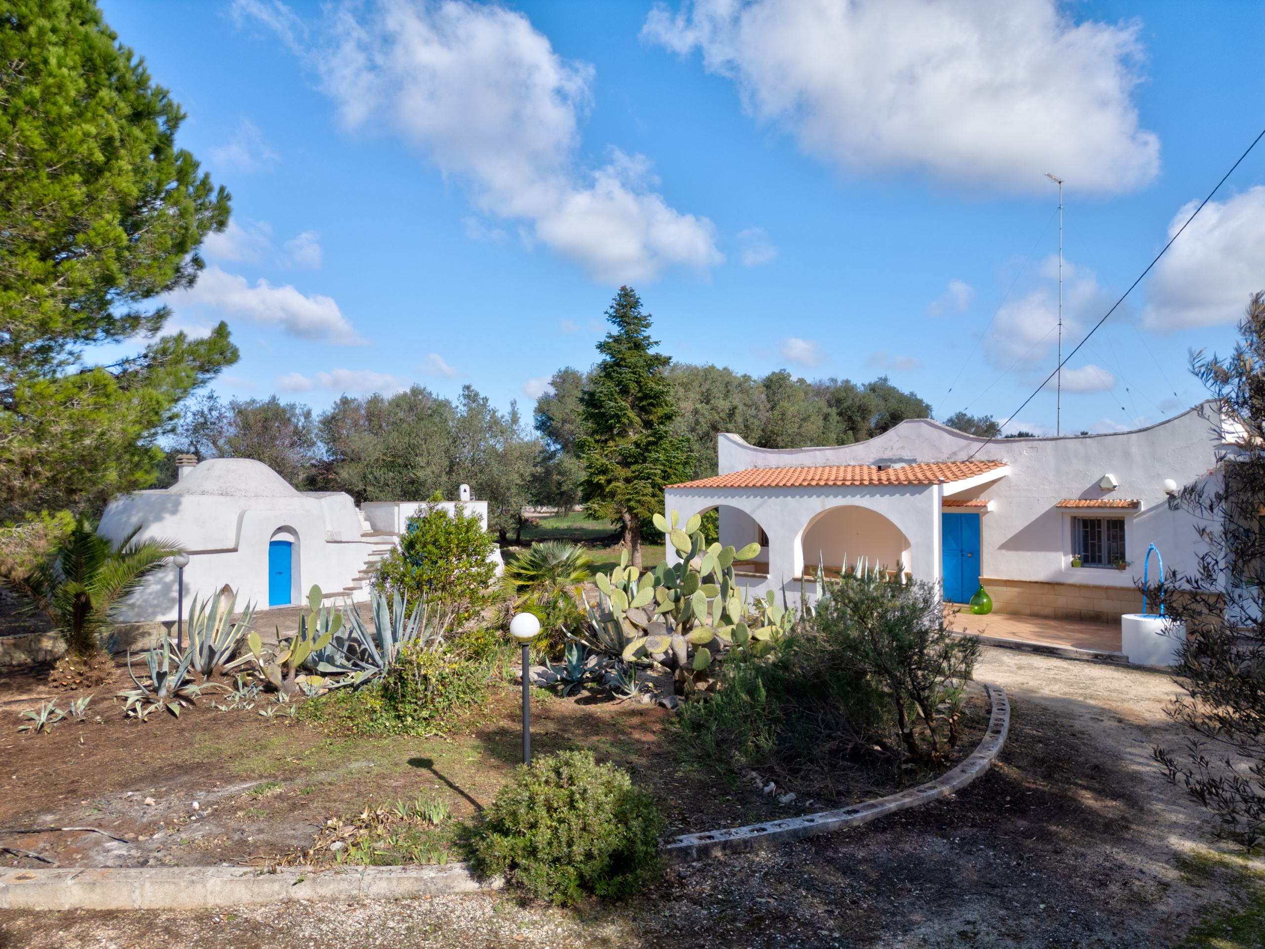 La dimora principale è composta da un trullo bianco finemente imbiancato e restaurato, affiancato da una lamia in pietra che conserva il fascino originario dellarchitettura rurale locale.