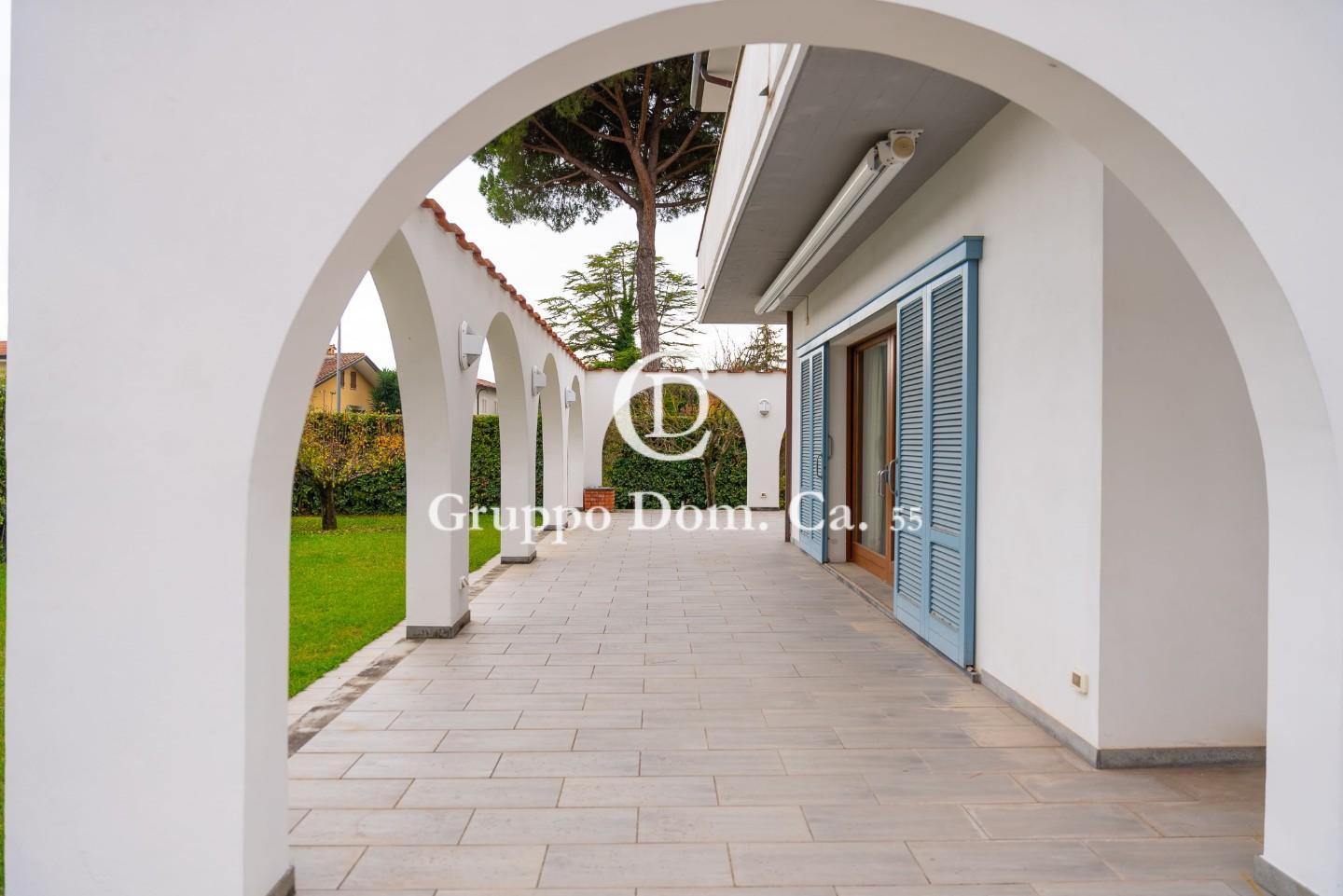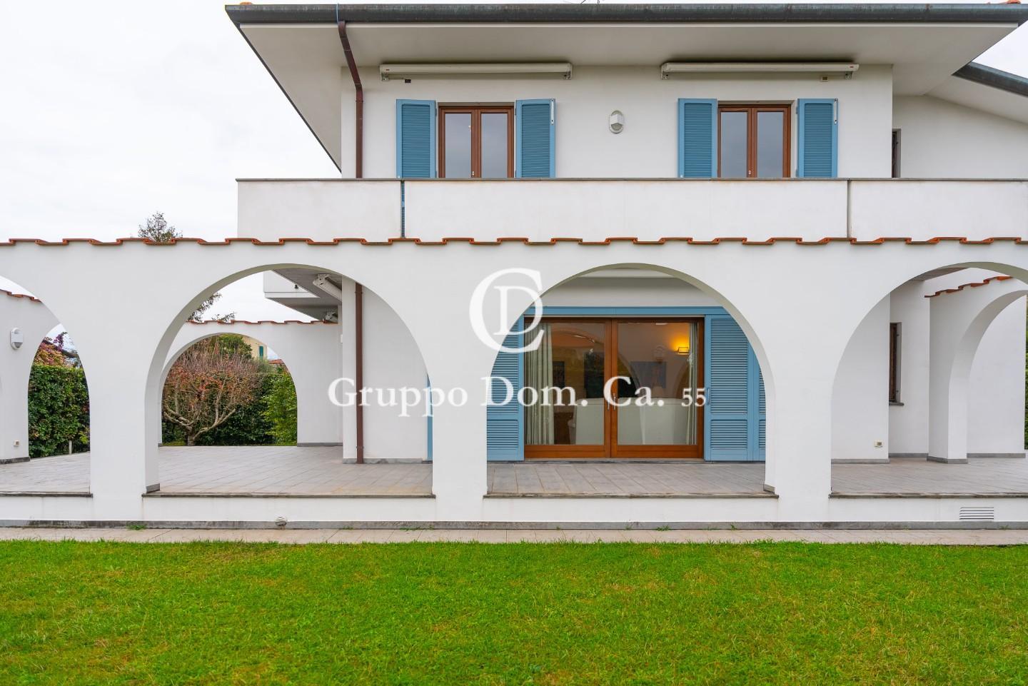 La villa si sviluppa su tre livelli piano seminterrato, piano terra e piano primo per una superficie complessiva di circa 273 m (252 m escluse aree scoperte). Larchitettura esterna, sobria ed elegante, presenta volumi armonici, porticati ad archi, balconi e finestre con persiane color carta da zucchero, elementi tipici del contesto versiliese.