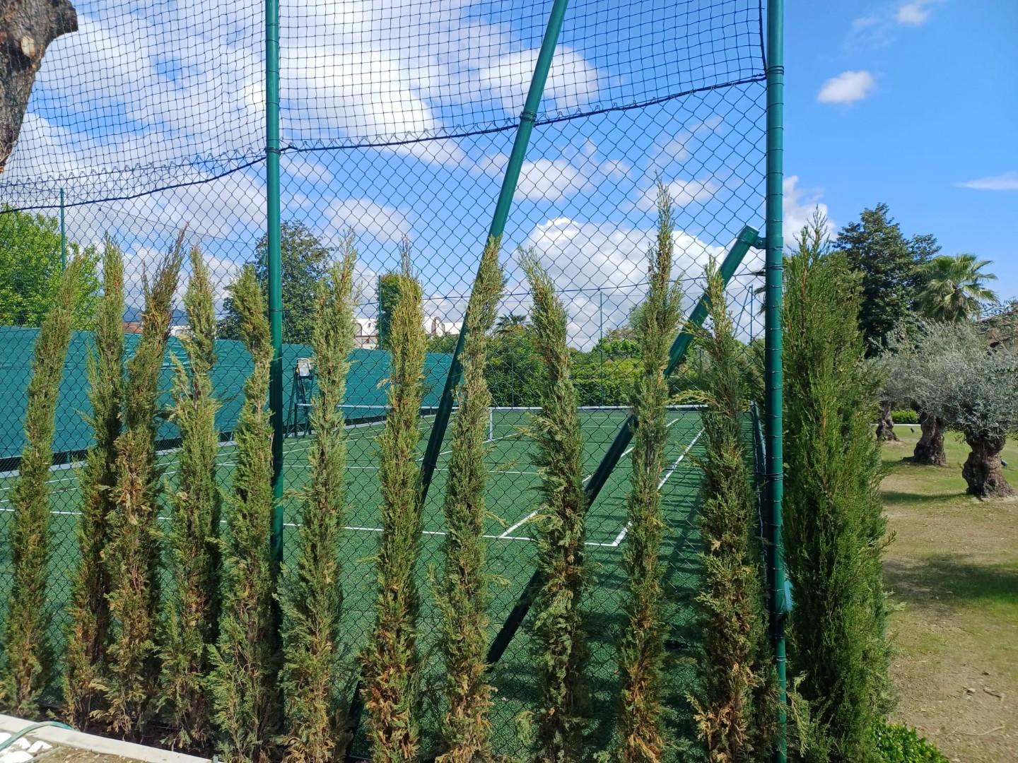 La villa è immersa nel verde circondata da fiori e piante a un parco di circa 4300 mq, una piscina elegante e un campo da tennis.