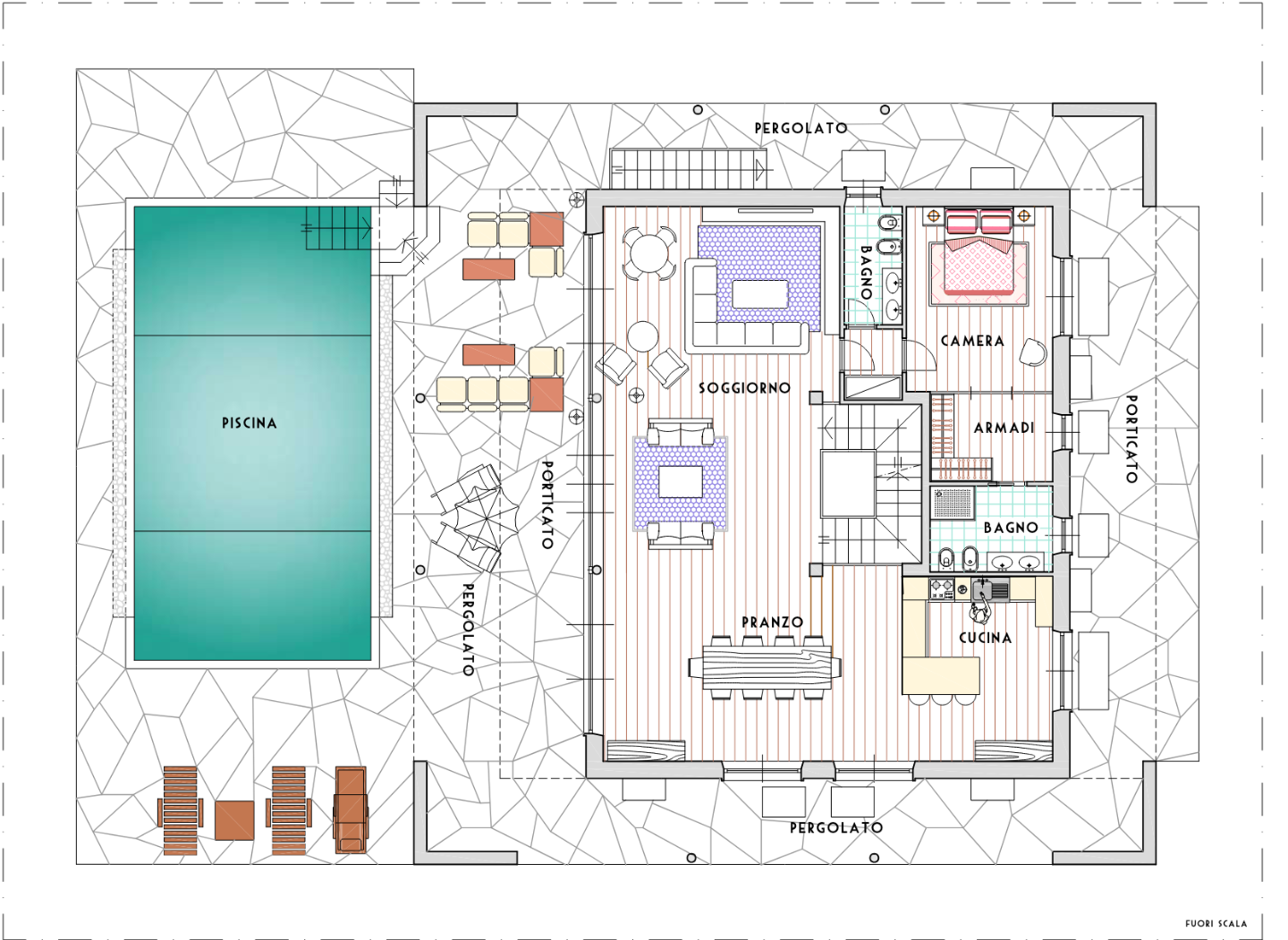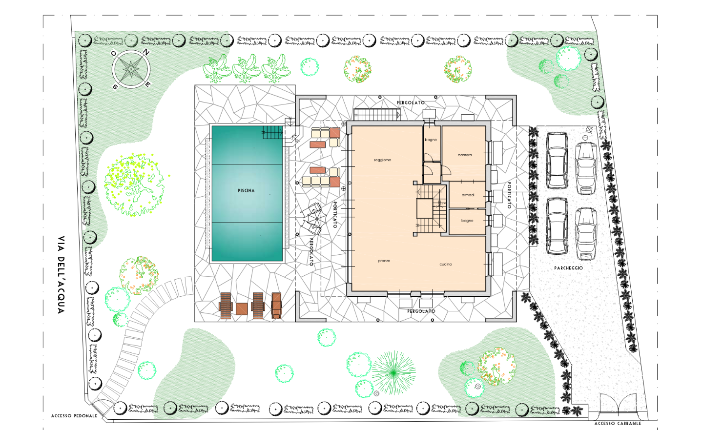 La villa si sviluppa su tre livelli, ed è corredata da ampio giardino con piscina.