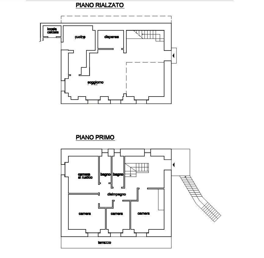Villetta di civile abitazione composta di due piani fuori terra: al piano rialzato soggiorno, cucina, locale dispensa e locale caldaia; al primo piano quattro camere, due bagni, disimpegno e terrazzo, con annesso giardino recintato, due autorimesse e bosco separato.