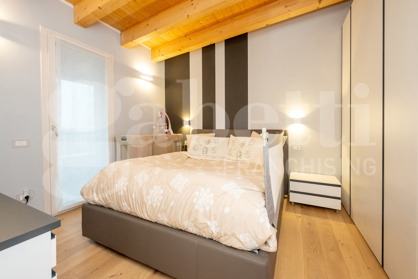 La zona notte, al piano primo, si compone di 3 camere da letto di cui una con un bagno finestrato esclusivo mentre le altre due sono servite da un secondo bagno di servizio finestrato; dalla camera matrimoniale si accede ad una loggia dedicata mentre dalle altre due camere ad un ampio terrazzo.