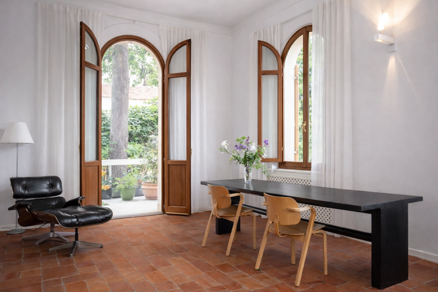 Sul retro, un ampio giardino di 1.100 mq accoglie unampia veranda finestrata di 40 mq, accessibile direttamente da cucina e salone, con vista sul verde.