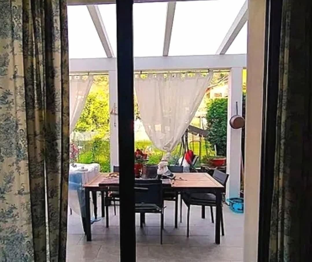 La veranda attrezzata sul giardino è perfetta per cene estive all'aperto.