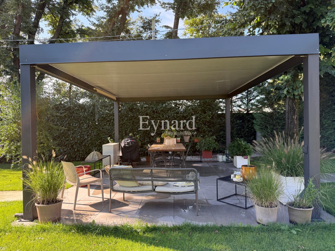 La proprietà è circondata da un giardino finemente piantumato e curato, impreziosito da una splendida piscina dotata di sterilizzatore salino, copertura elettrica automatica, pompa di calore e sistema di controllo automatico dell'acqua.