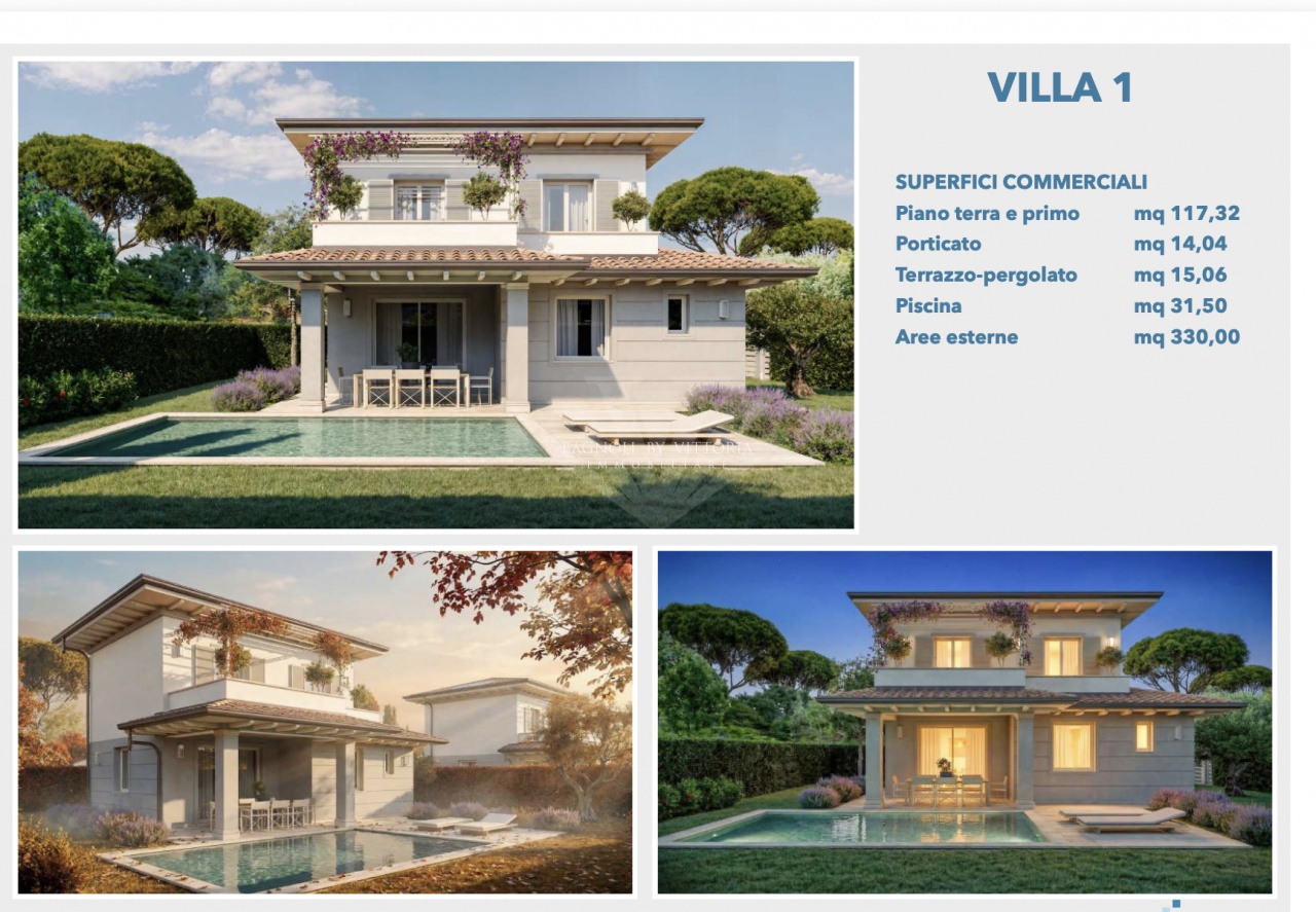 Marina di Pietrasanta località Tonfano : complesso immobiliare comprendente 4 ville unifamiliari con giardino privato, posti auto e realizzazione di piscina (extra capitolato) della misura di mq. 31,50 Ciascuna villa è composta da: Piano terra con ampia sala soggiorno-pranzo con angolo cottura con accesso sulla piacevole veranda, 1 camera matrimoniale ed un bagno.