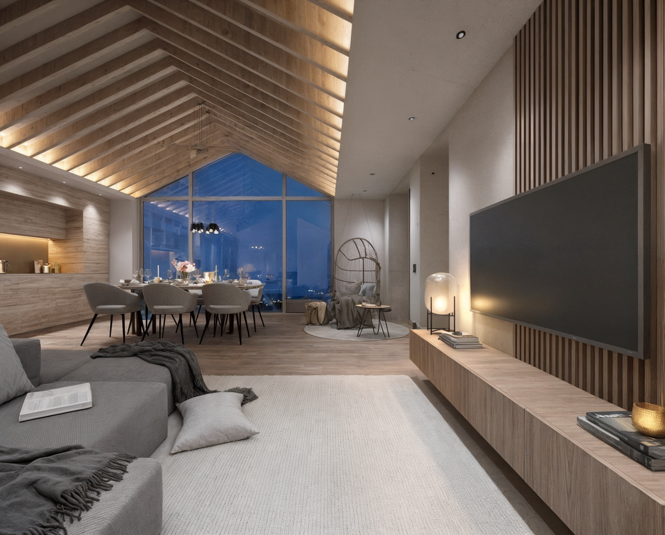 The property features a living area with an open-plan kitchen of approximately 34 sqm, with access to a 58 sqm loggiaperfect for enjoying relaxing outdoor moments.