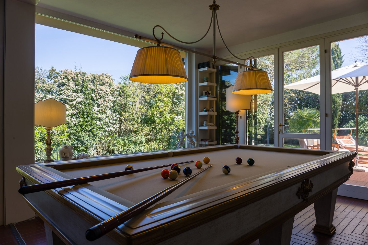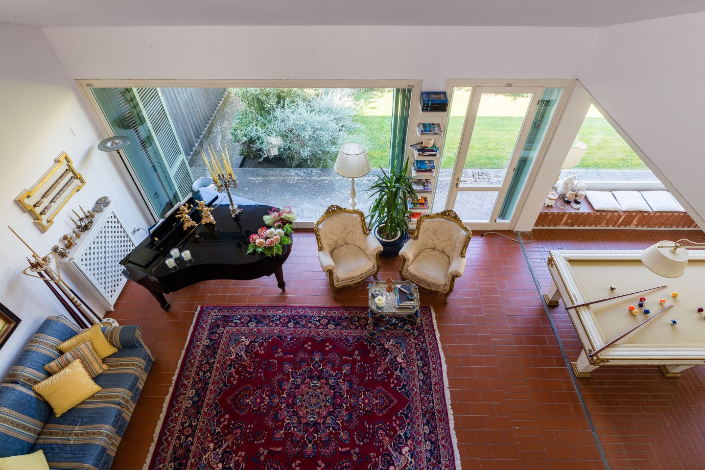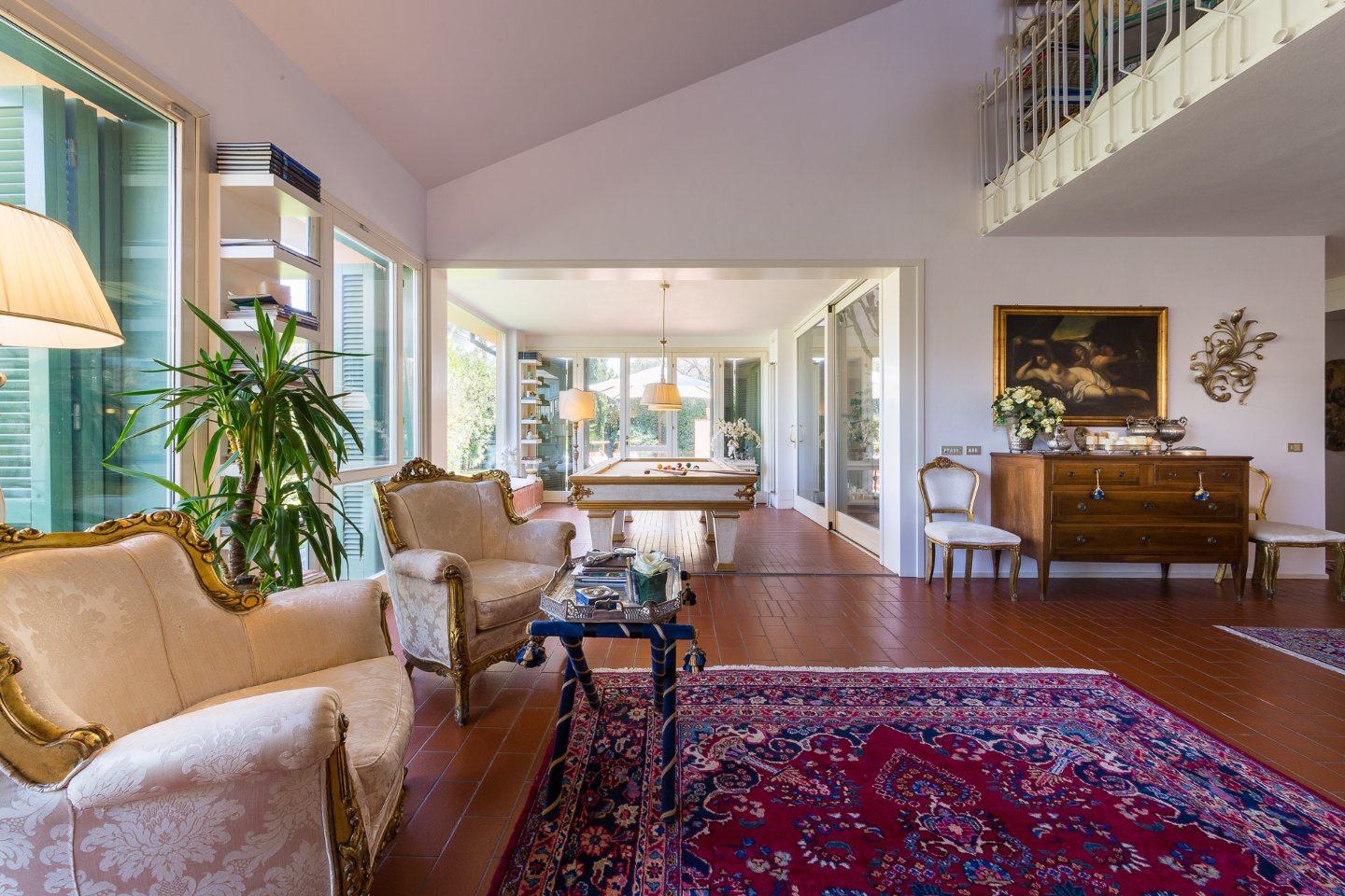 COMPOSIZIONE: ingresso, grande zona living costituita da salone con camino, sala biliardo, chiostra interna, sala pranzo, cucina, veranda vetrata con giardino d'inverno, disimpegno, bagno, grande locale lavanderia, suite matrimoniale con locale armadi e sala da bagno, camera con bagno privato e studio, ulteriore camera con bagno di servizio interno, locale armadi, grande ballatoio-studio con affaccio "doppio volume" sulla zona living.