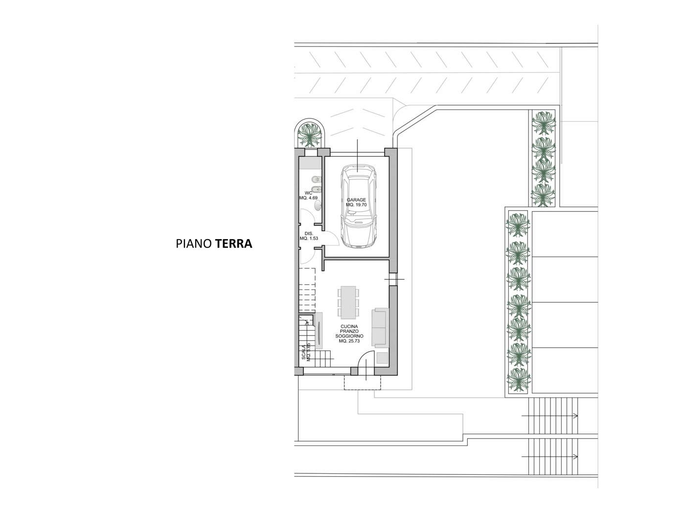 Un open space luminoso che unisce soggiorno e cucina, un bagno di servizio e un comodo garage privato.