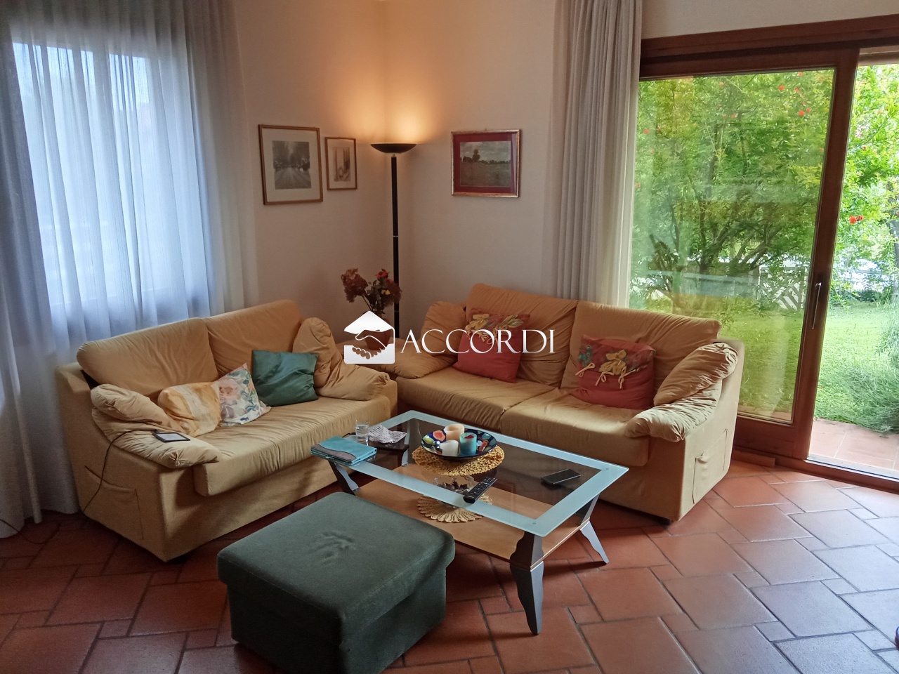 Entrando nell'abitazione vi è un atrio che introduce allo spazioso e luminoso soggiorno con ampia vetrata sul giardino, cucina separata ed abitabile, un locale che puo' essere adibito a studio, sala giochi, ... ed un primo servizio.
