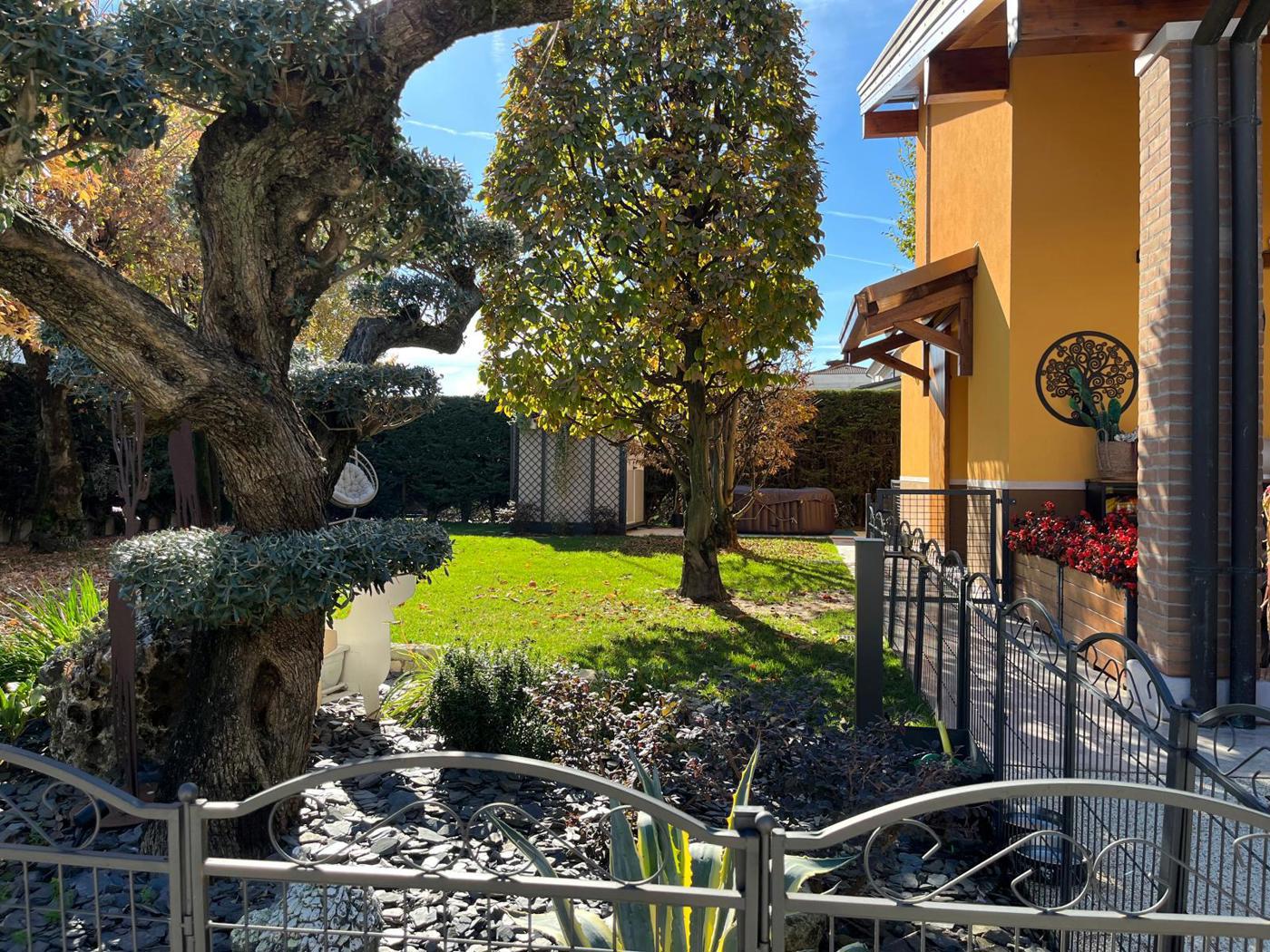 Grande giardino che circonda l'intera propriet ben curato con piante ornamentali ad alto fusto e angolo orto; pavimentazione esterna di nuova realizzazione per area manovra auto che porta ai 3 garage interrati con possibilit di parcheggio per 4 auto. Dal portico si accede al salotto con camino, soggiorno con ulteriore camino, cucina con uscita su portico che dispone di ulteriore cucina comoda per pranzi e cene all'aperto.