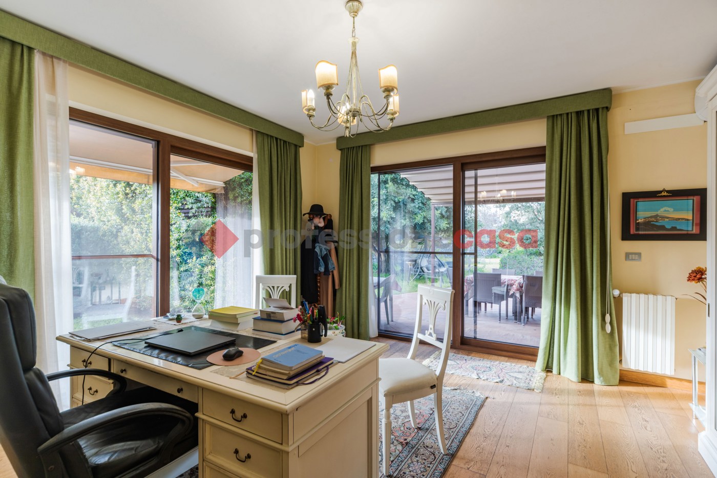 Il piano terra si apre su un meraviglioso giardino di 530 mq dove possibile realizzare anche una piscina, ed un ulteriore spazio esterno terrazzato di 80 mq circa; internamente sono presenti uno studio, due comode camere da letto, due servizi ed un disimpegno che d accesso al piano sottostante tramite un'elegante scala di design.