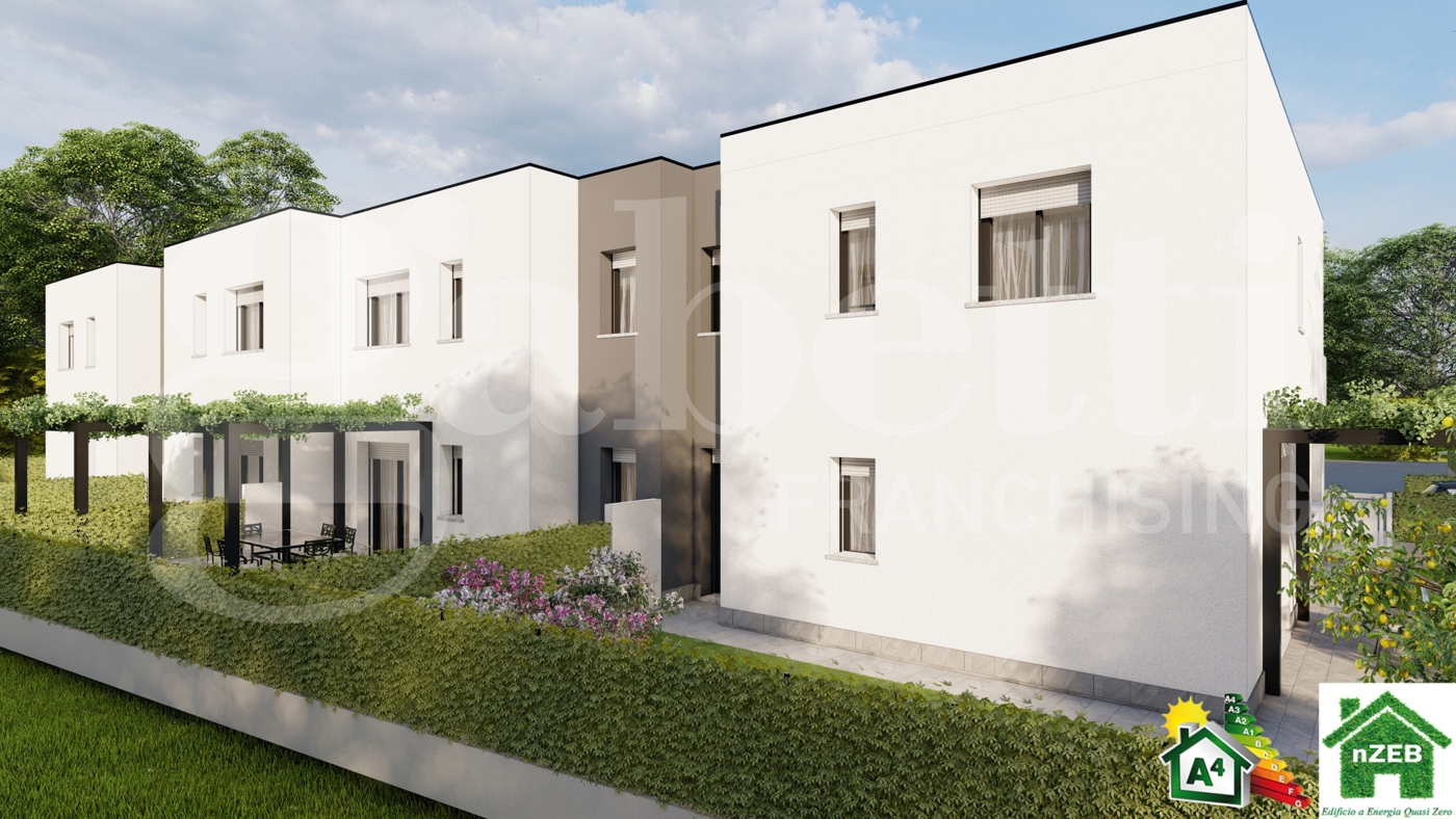 SUDDIVISIONE DEGLI SPAZI: - 1 cucina-soggiorno di circa 46 mq; - 1 camera da letto matrimoniale di circa 17 mq; - 1 camera da letto matrimoniale di circa 14 mq; - 1 camera doppia di circa 12 mq; - 1 studio di circa 8 mq; - 2 bagni finestrati di servizio; - Scoperto esclusivo di circa 185 mq; - 1 garage; - 1 posto auto interno di circa 15 mq. CARATTERISTICHE E PARTICOLARI: -IMPIANTO FOTOVOLTAICO DI 4 KW. -RISCALDAMENTO A PAVIMENTO IN POMPA DI CALORE.