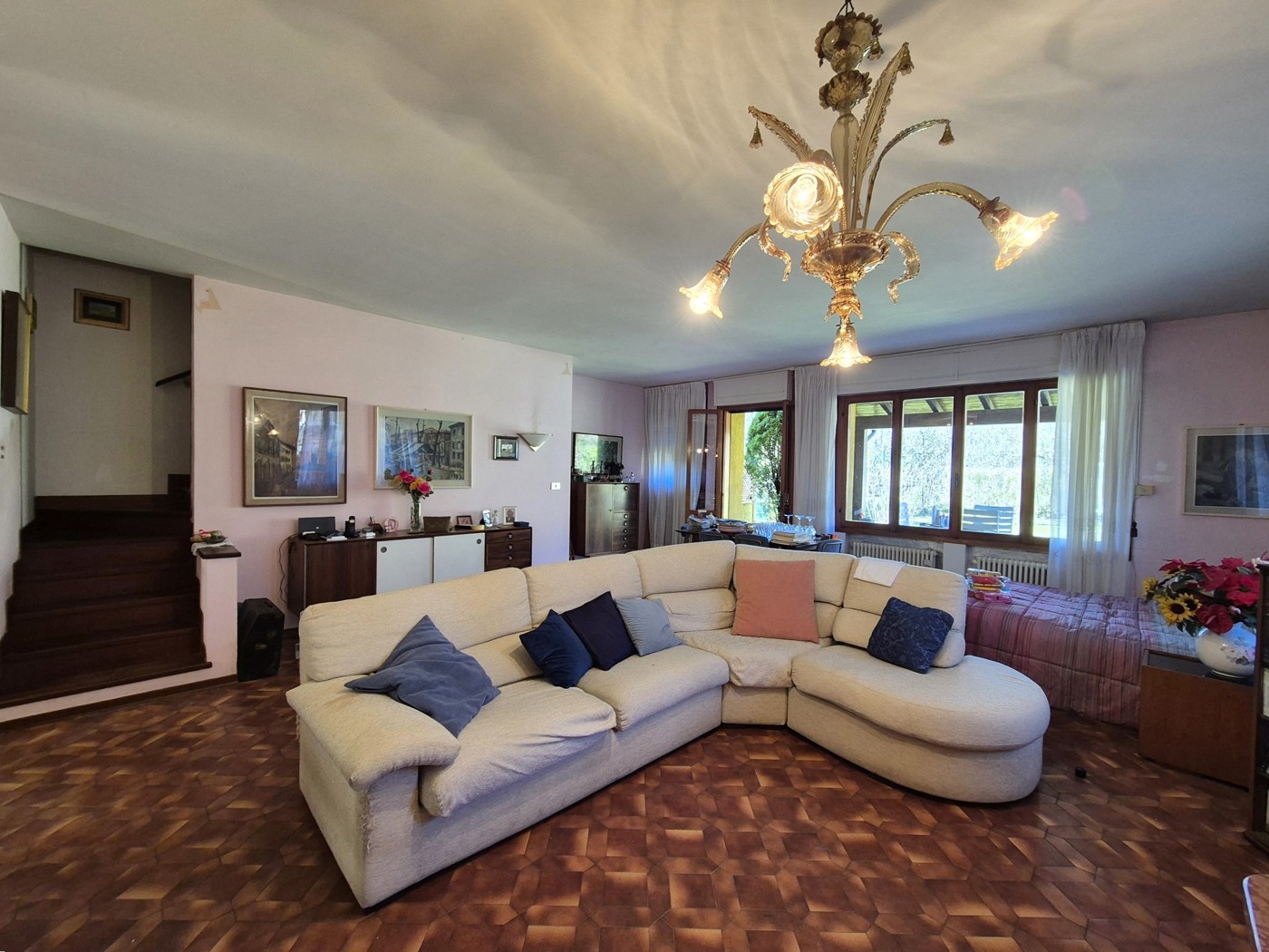 Dal soggiorno una scala interna conduce al piano interrato composto da una taverna con camino.