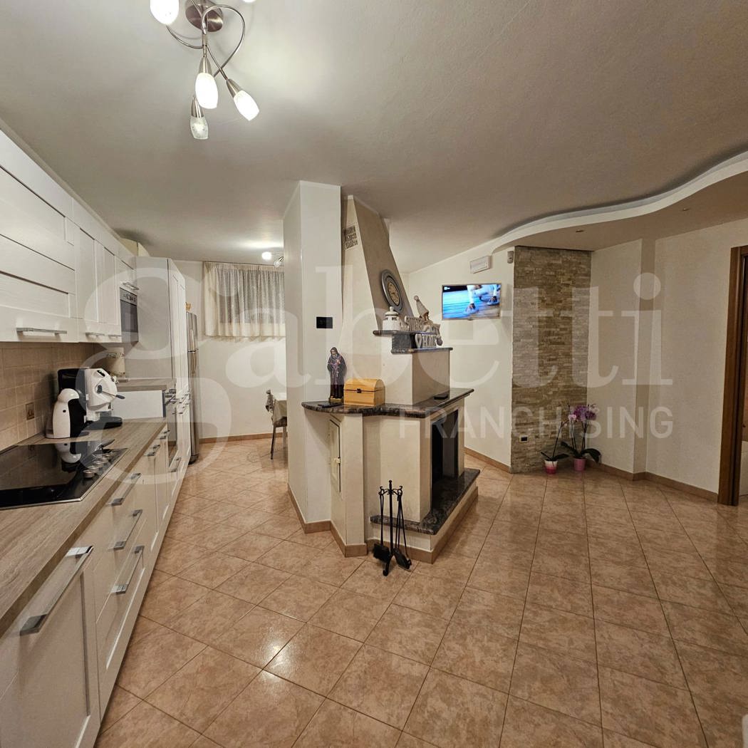 All'ingresso, un accogliente soggiorno con angolo cottura con termocamino crea un'atmosfera calda e accogliente, perfetta per momenti di relax in famiglia o con gli amici.