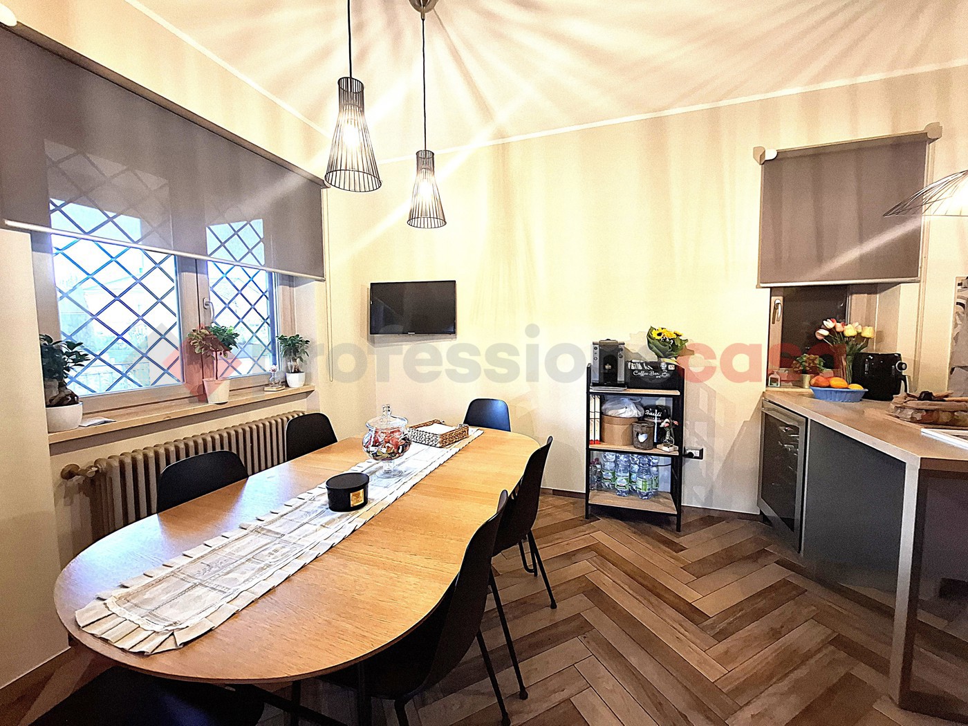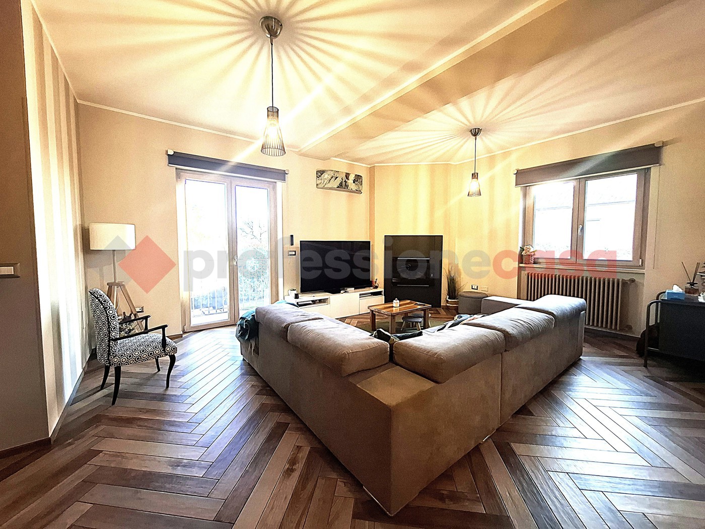 Il piano terra, introdotto e arricchito da una veranda che permette di godere della vista sul giardino privato, dedicato alla zona giorno open space che accoglie gli ospiti in un ambiente caldo e luminoso , dotato di termocamino a doppia alimentazione e ampie finestre con affaccio sull'area relax . Qui si trova anche l'area pranzo e cucina, perfettamente attrezzata e pronta per accogliere i momenti conviviali con famiglia e amici.