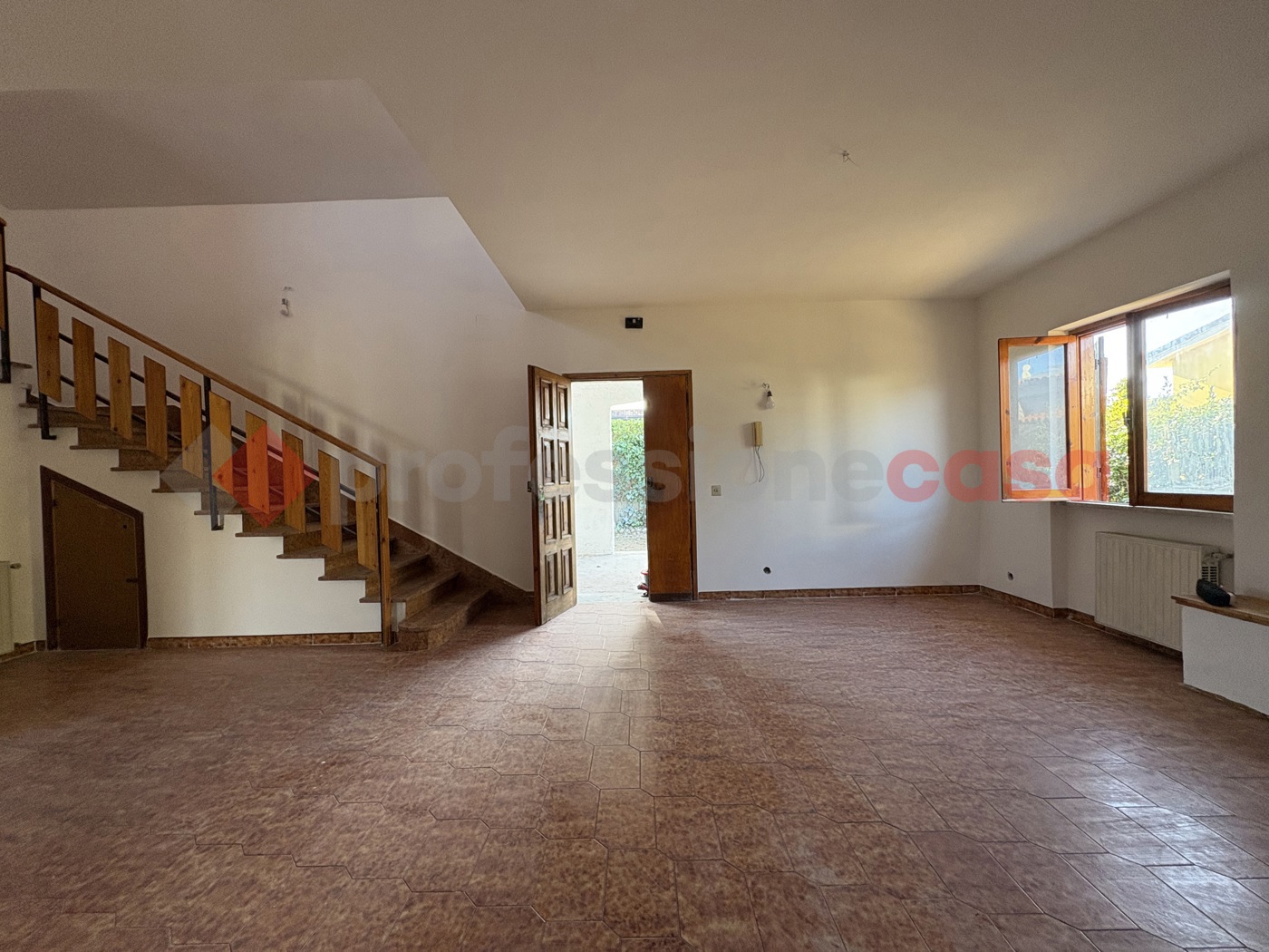 Troviamo in fondo al salone un bagnetto di servizio, mentre sulla sinistra una comoda cucina abitabile con finestra e porta finestra che consente l'uscita sul giardino, a seguire troviamo la stanza da letto, l'unica posta al piano terra, ed un comodo ripostiglio interno ricavato nel sottoscala, tutta la casa risulta essere molto luminosa grazie alla presenza di molte finestre.