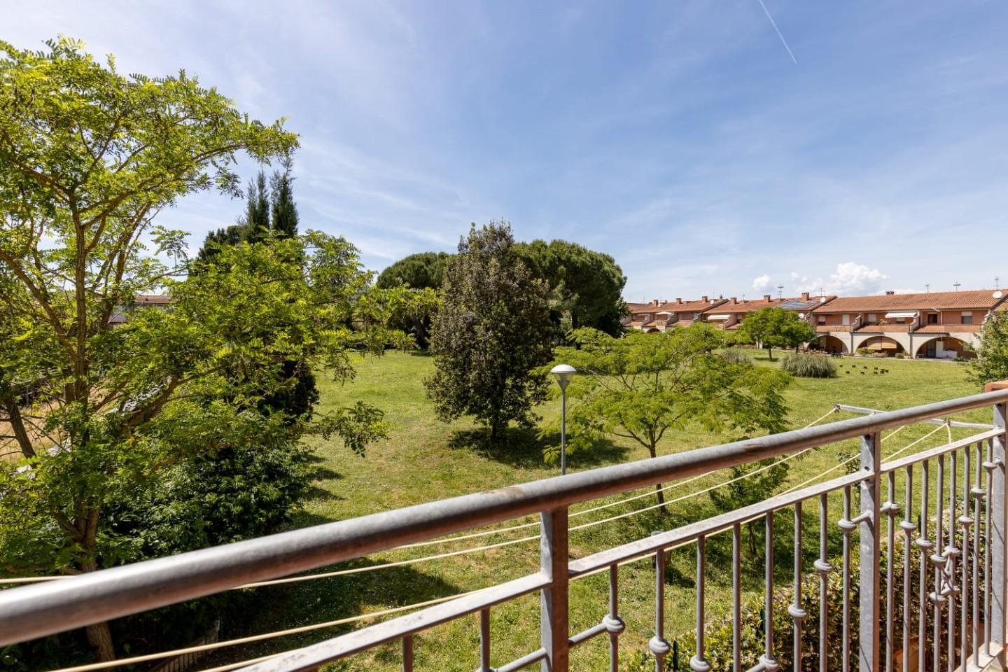 The ground floor comprises a large entrance hall, living room with a working fireplace, eat-in kitchen with access to a comfortable rear courtyard, ideal for al fresco dining, a bathroom, and a large garage with laundry room. A bright staircase leads to the first floor, which features a practical hallway, two double bedrooms, both with terraces, one overlooking the park, and a bathroom.