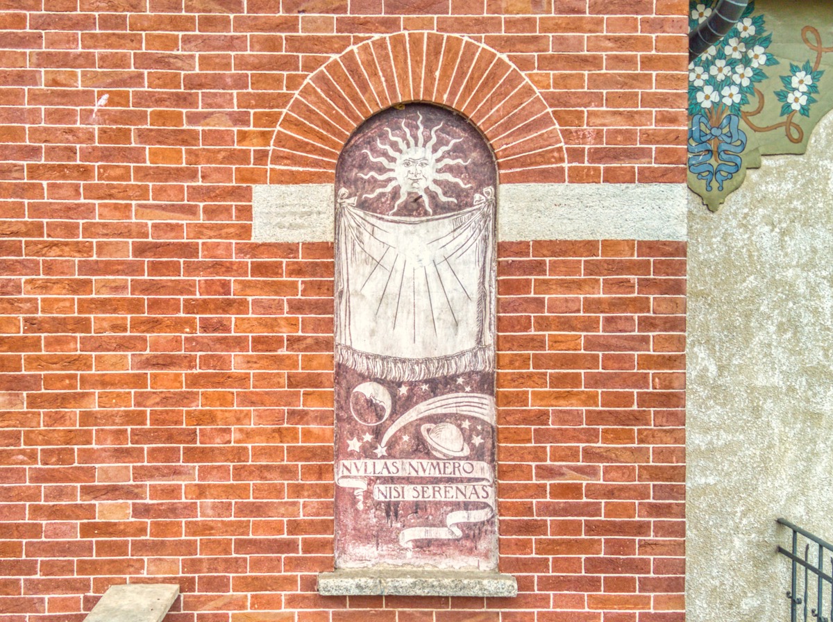 La bellissima meridiana dipinta con il motto Nullas numero nisi serenas ( Conto solo le ore serene) compare sulla facciata del 1924 in adiacenza alla facciata liberty del 1902 e pare ammorbidire lapparente contrasto di due bellissimi e diversi stili architettonici entrambi interpretati dai migliori autori.