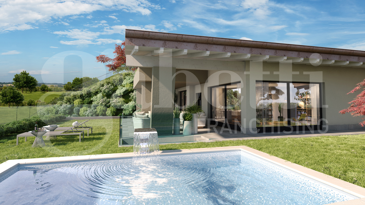 A lato di questa area, presente una piscina di dimensioni adeguate, progettata per offrire unesperienza di relax e intrattenimento confortevole.