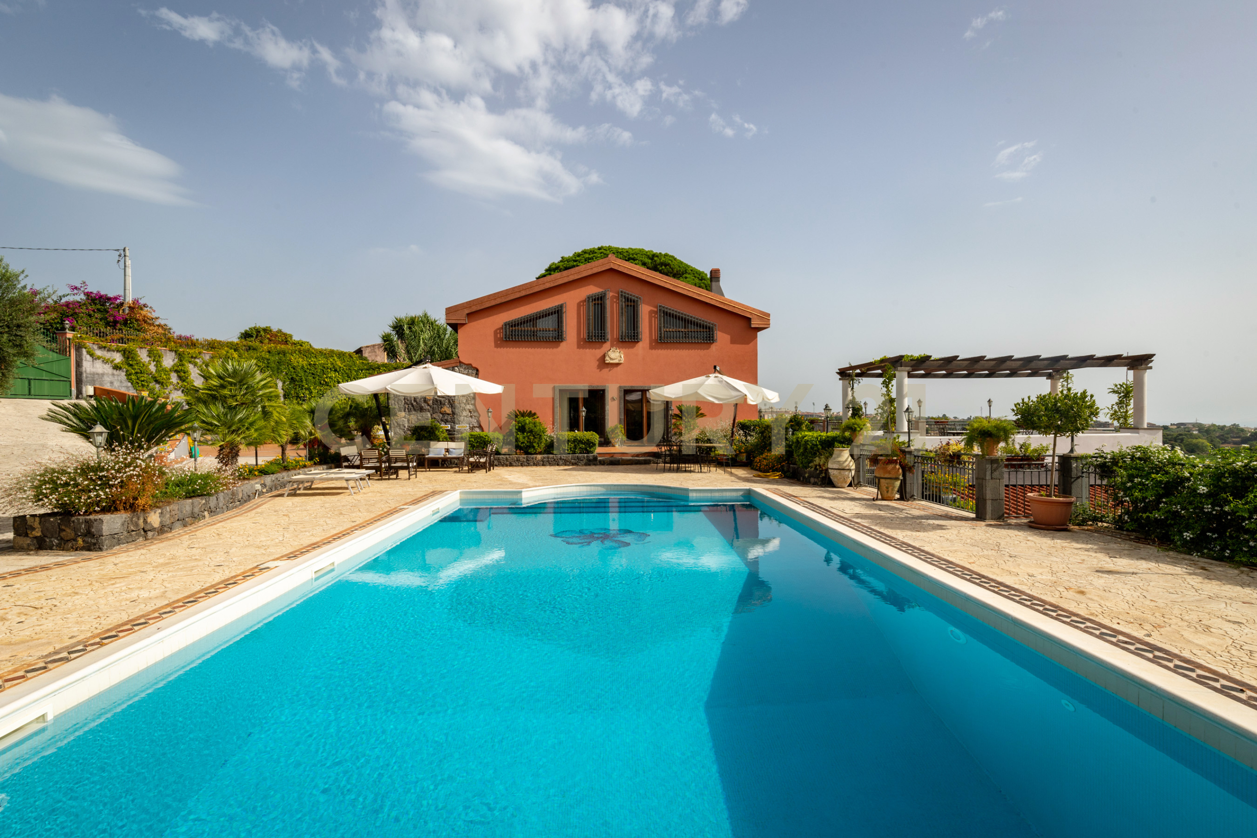La casa è circondata da terrazze e pergolati, sapientemente suddivisi in aree private e di intrattenimento, da cui è possibile ammirare un panorama unico ed in lontananza il mare. Passeggiando per il parco si scoprono angoli suggestivi ed aree relax incorniciate da spazi verdi perfettamente curati.