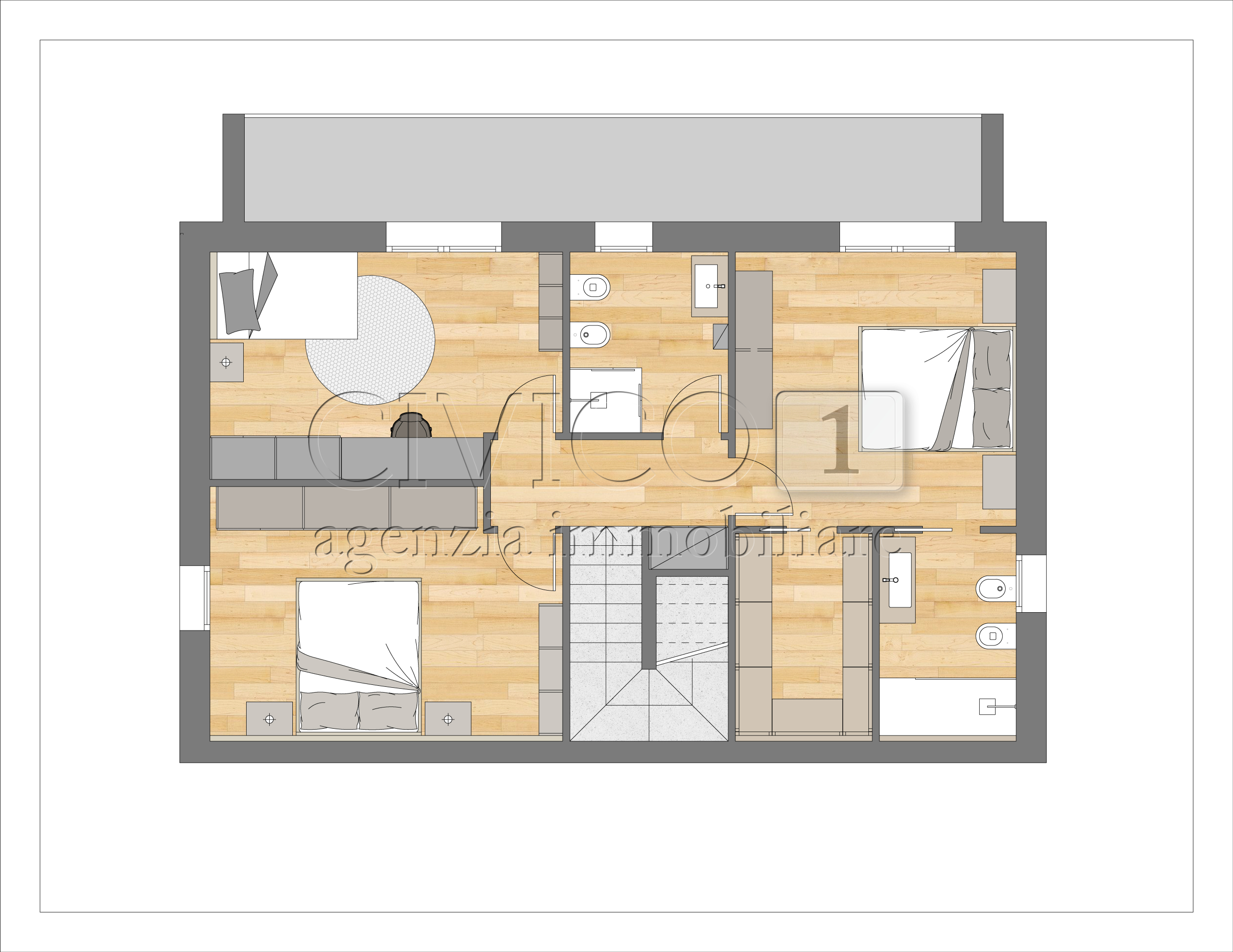 - Bagni: Tre servizi finestrati, uno al piano terra e due al primo piano, uno dedicato alla camera padronale e uno per le altre due camere matrimoniali.