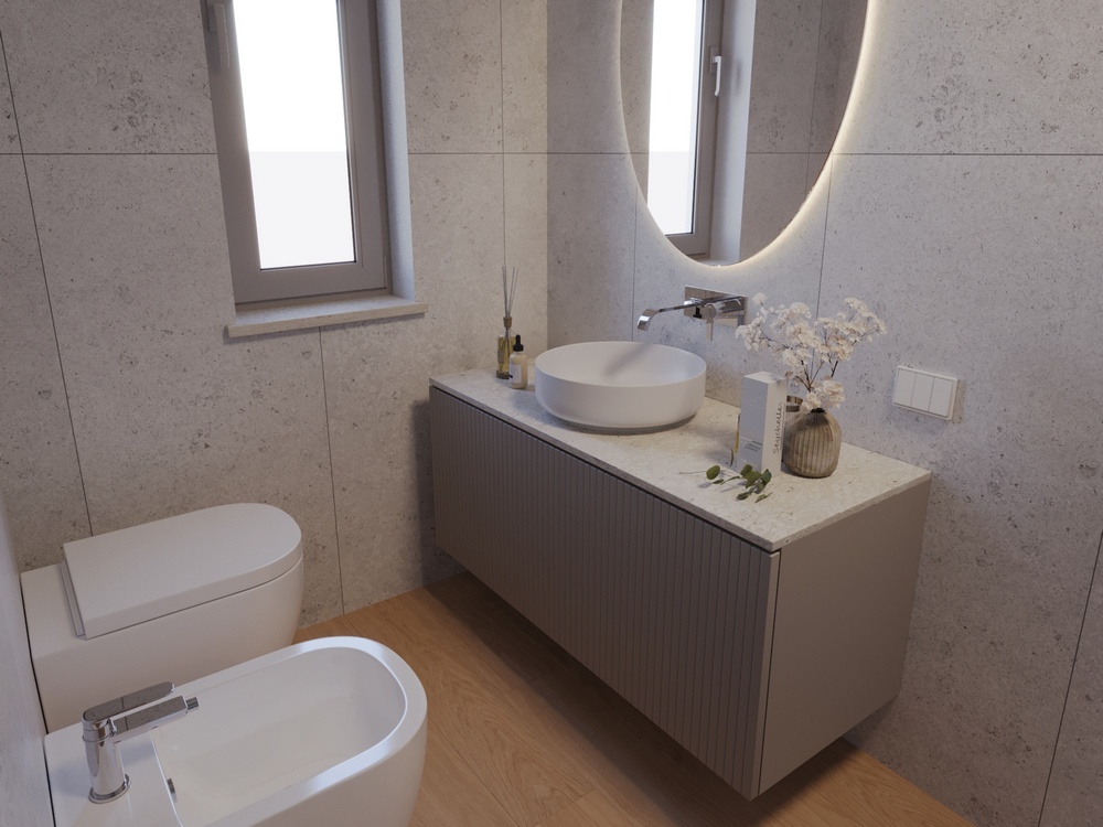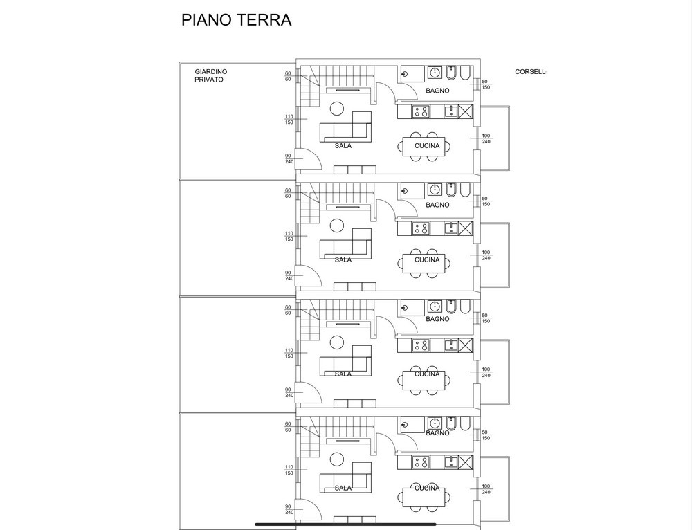 Ogni villetta si sviluppa su tre livelli: - piano terra: ingresso privato, luminosa zona giorno open space con cucina a vista, balcone, disimpegno e bagno; - primo piano: una spaziosa camera matrimoniale, una camera singola, secondo bagno e due balconi; - piano interrato: garage, lavanderia e cantina.