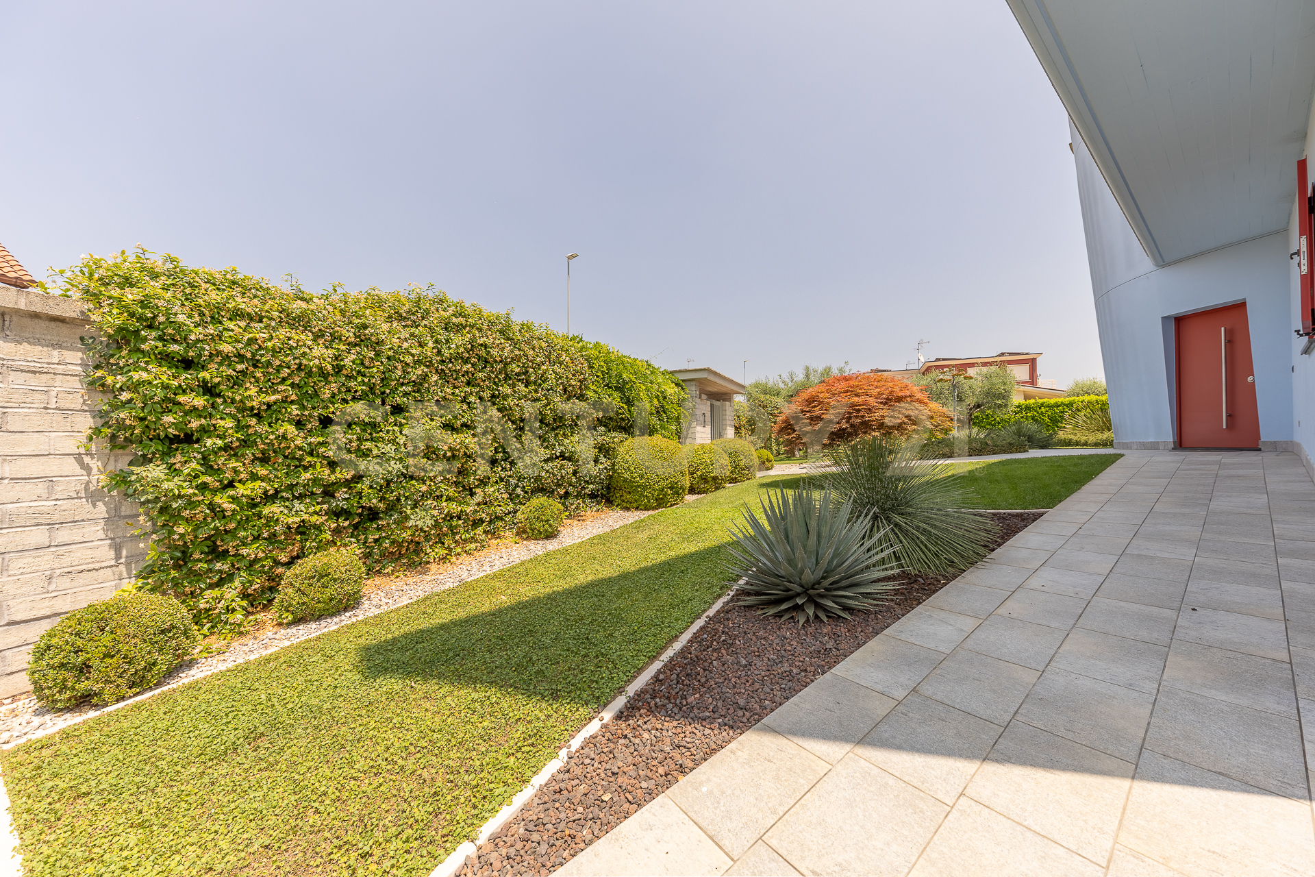 La villa si sviluppa su due livelli: al piano terra troviamo un grande soggiorno open space con cucina a vista, caratterizzato da una splendida porta a vetri che si apre direttamente sul giardino privato.