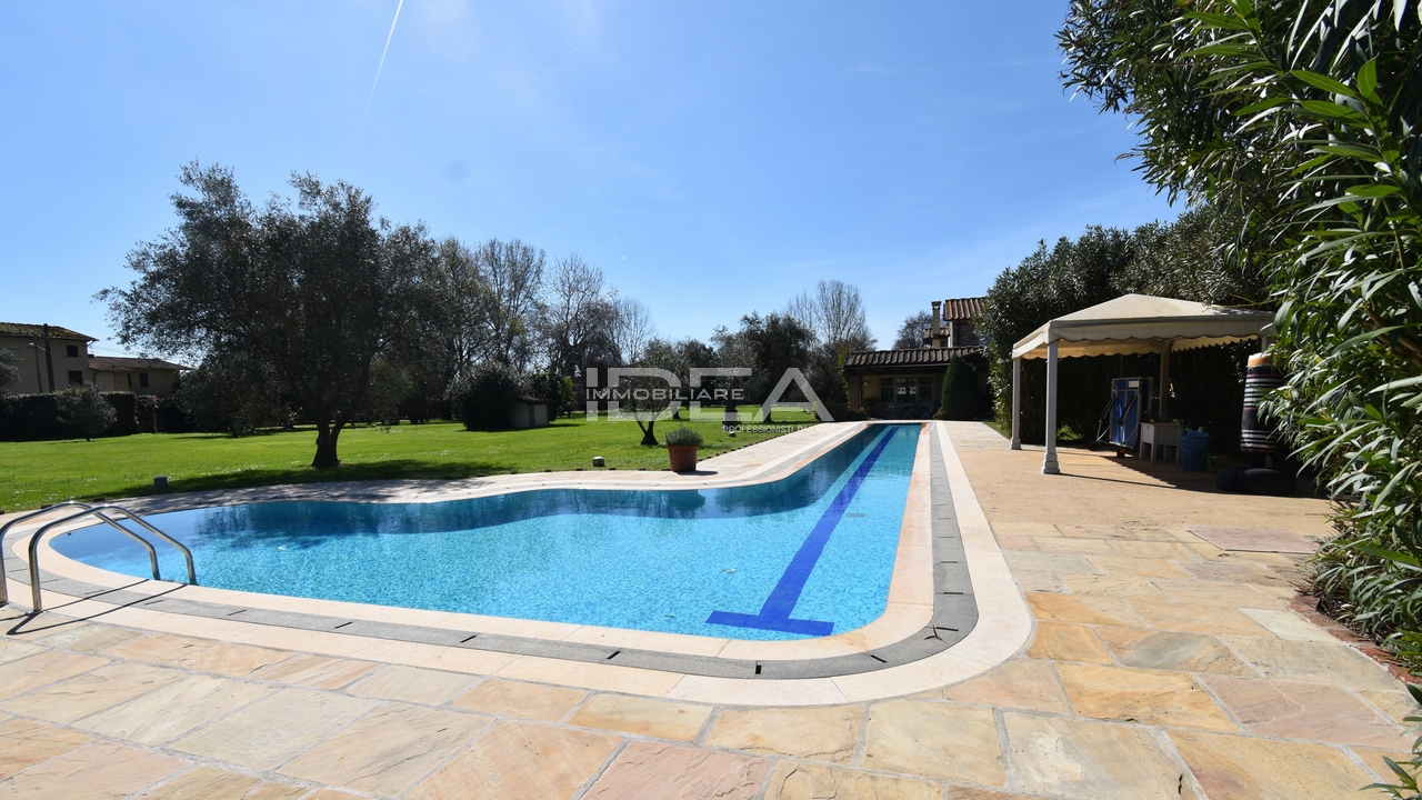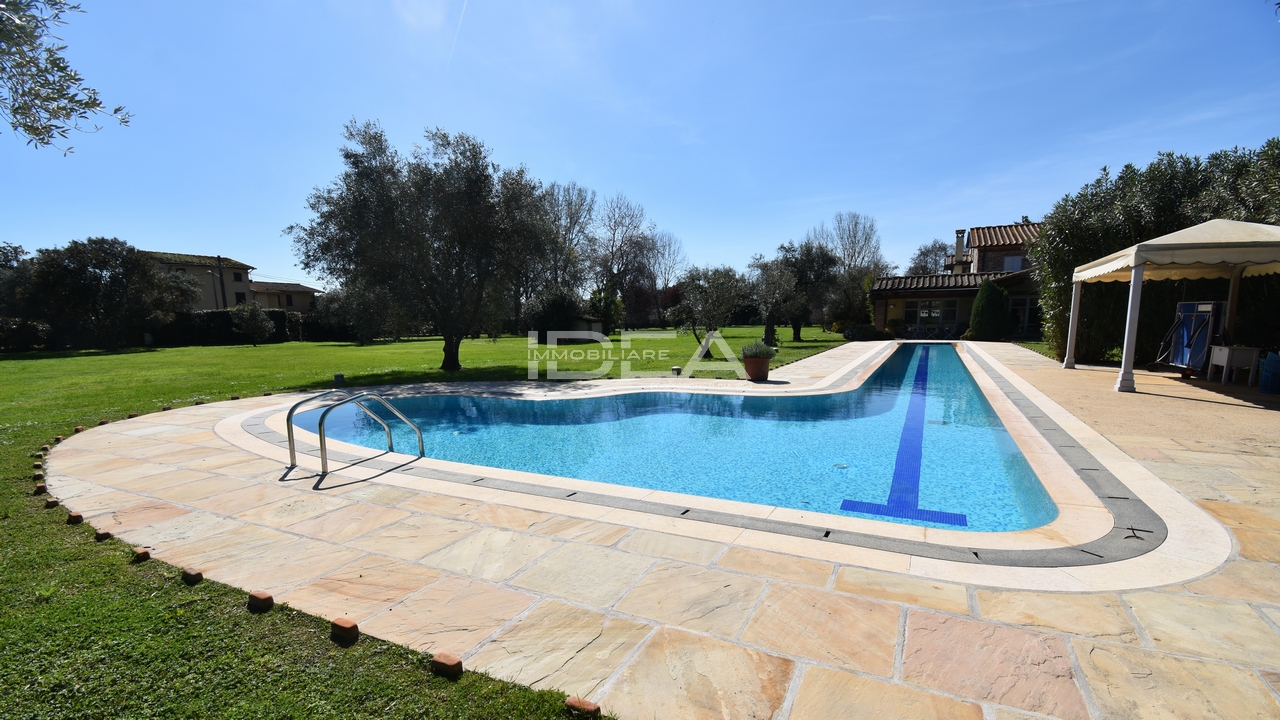 Circondata da un parco privato di 1,5 ettari con alberi maestosi, offre una piscina riscaldata di 80 mq, una zona spa con idromassaggio e una raffinata veranda esterna, ideale per immergersi nella tranquillit e nelleleganza del luogo.