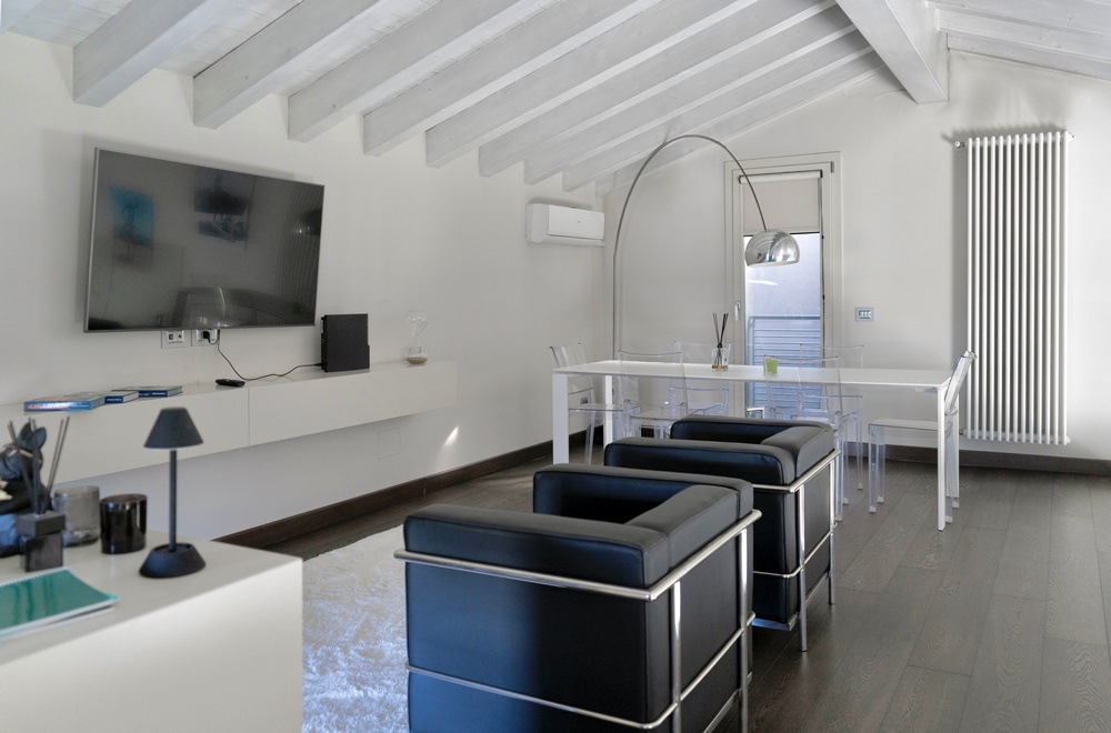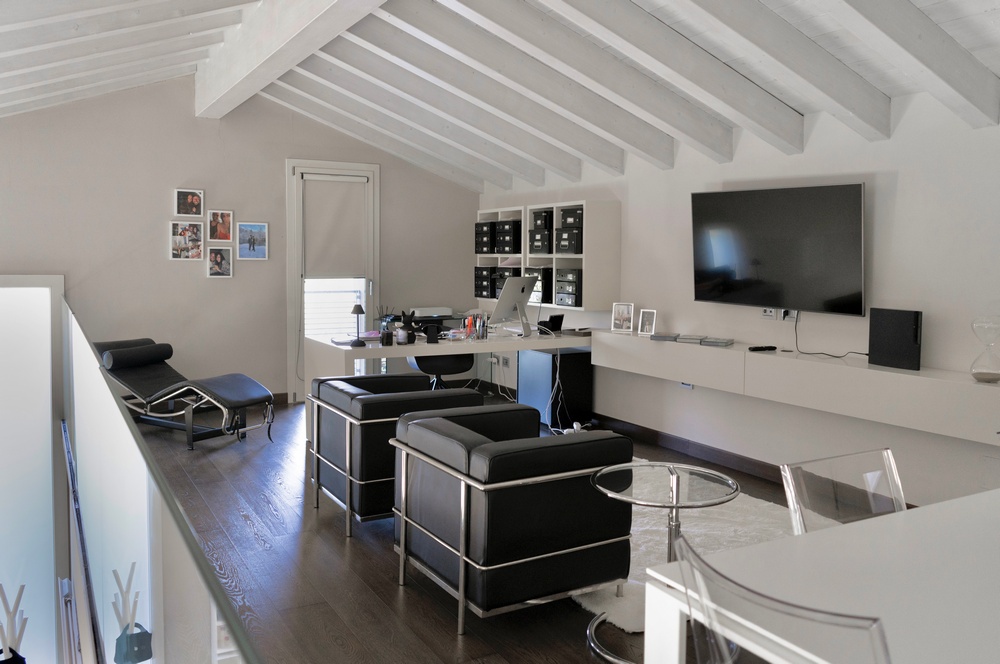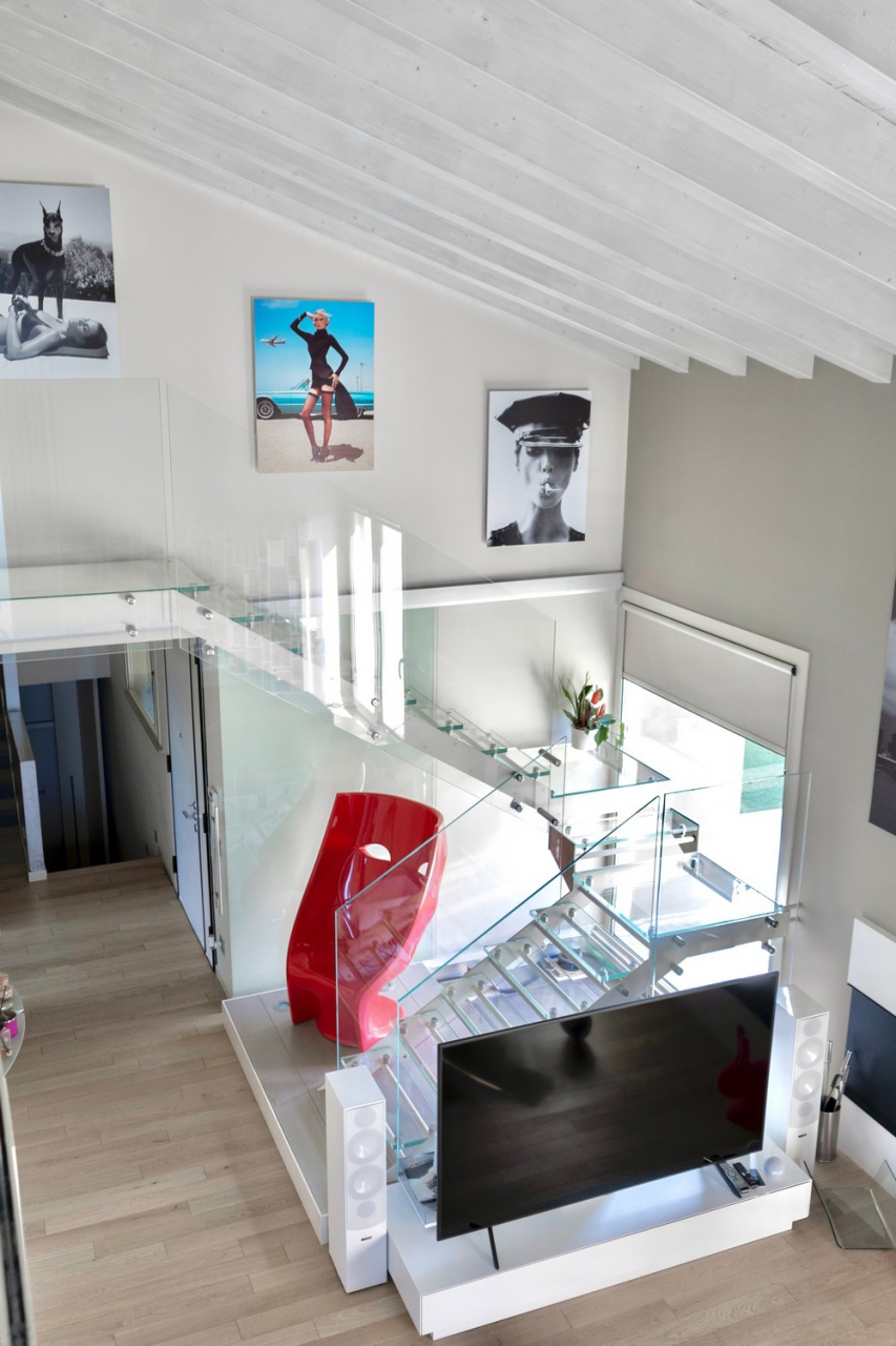 Sopra la zona living si apre un elegante soppalco con travi a vista sbiancate e parapetto in cristallo, perfetto come area relax o studio.