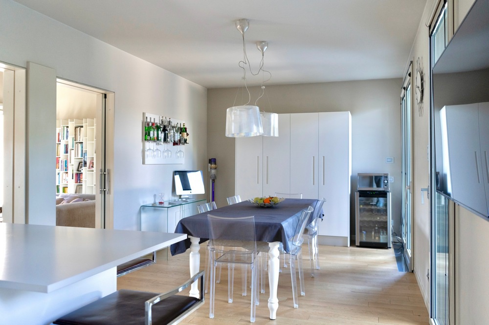L'abitazione, impreziosita da finiture di pregio, offre un'ampia e luminosa zona giorno con camino e grande cucina abitabile affacciata sul portico con accesso diretto alla piscina.