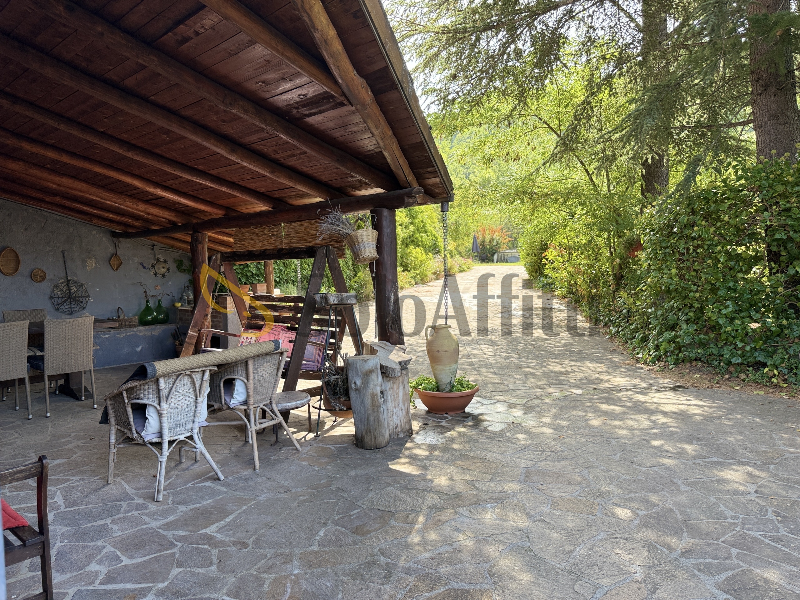 Labitazione è circondata da un ampio giardino privato e dispone di una corte esterna con portici, perfetta per momenti di relax allaperto.