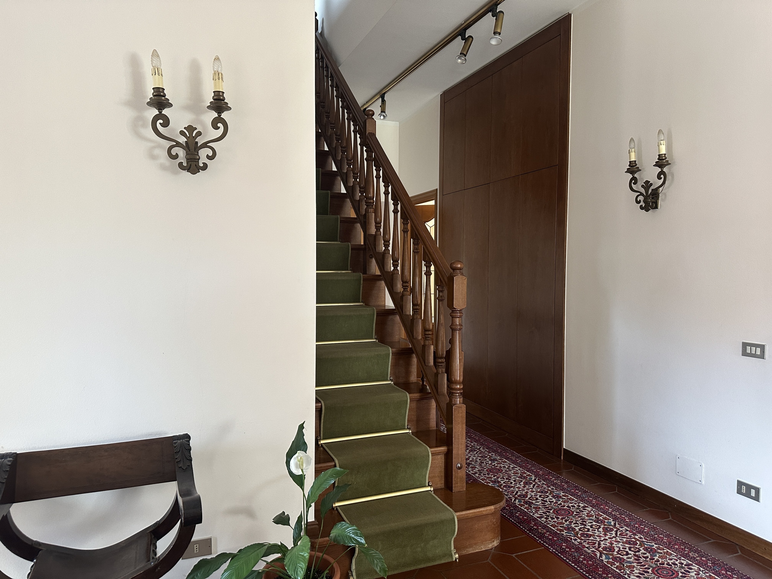 Al primo piano, accessibile tramite scala interna in legno pregiato, si sviluppa in un ambiente mansardato che offre un ulteriore soggiorno doppio, una camera matrimoniale, due cabine armadio (di cui una utilizzabile anche come ripostiglio), uno studio e un ampio bagno con doccia.