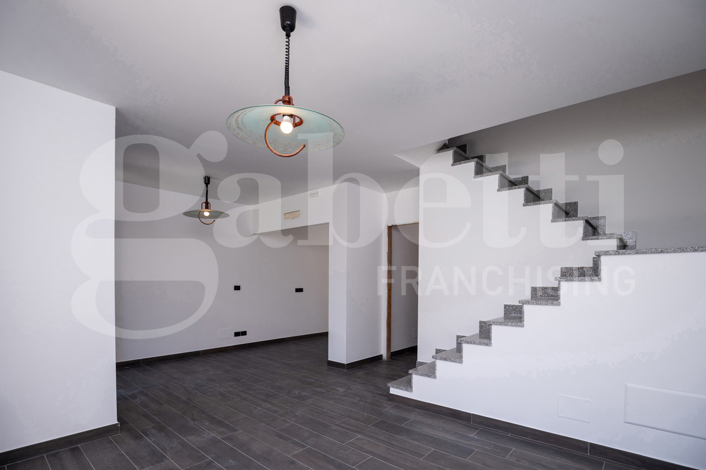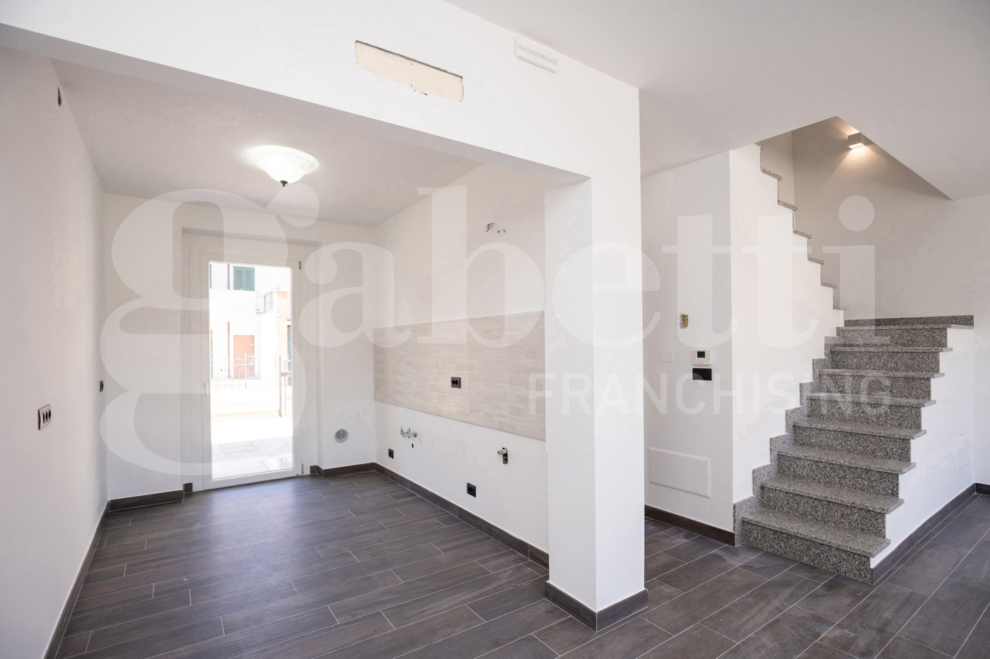 Piano terra: ingresso su luminoso soggiorno, zona pranzo con cucina a vista e pratico bagno di servizio con box doccia.