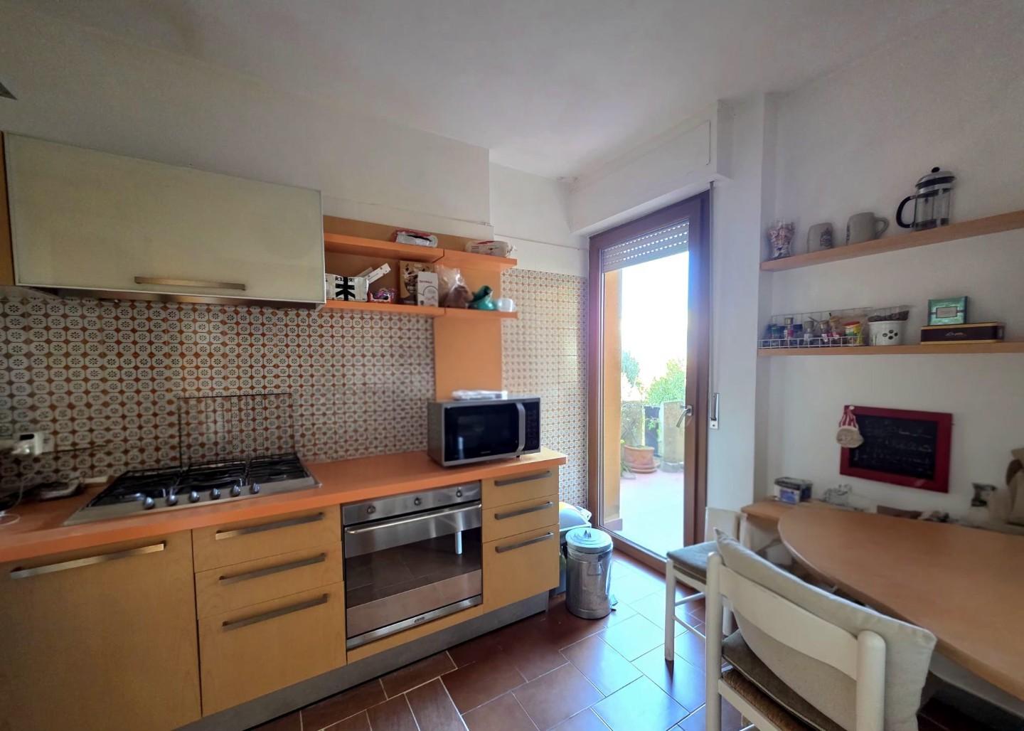 L'ultimo piano, mansardato, attualmente utilizzato come terza camera, dispone di una ricercata privacy e di una grandissima terrazza di mq 50, con parziale VISTA MARE, adatta come solarium, completamente rifatta, insieme al tetto nel 2013. L'appartamento ha il riscaldamento autonomo ed è dotata di 3 condizionatori.