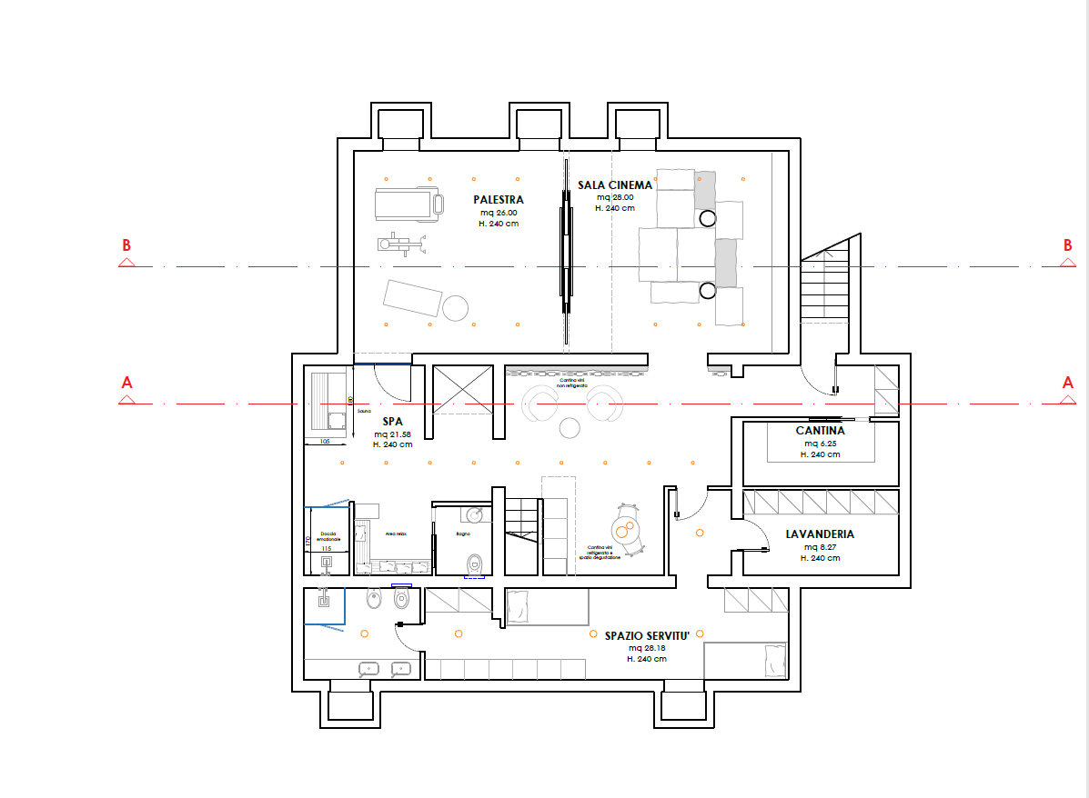 Ampio e luminoso interrato dove poter realizzare un piccolo appartamento di servizio composto da camera e bagno oltre a lavanderia, spa, palestra e cantina.