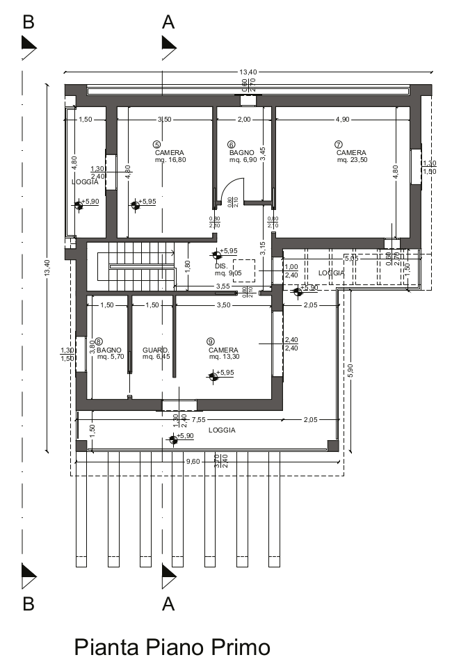 Il primo piano ospita tre spaziose camere da letto matrimoniali, di cui una con bagno privato e guardaroba, tutte dotate di accesso a una loggia, oltre a un secondo bagno.