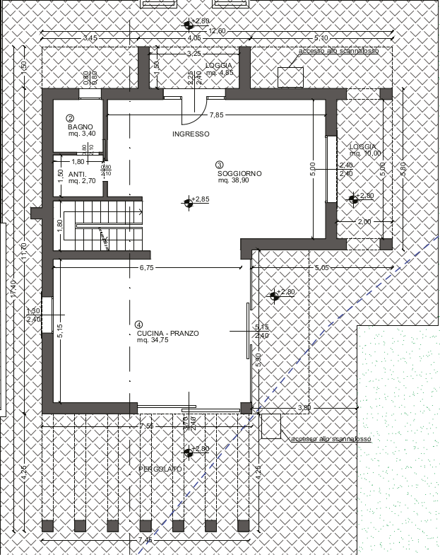Al piano terra, la villa offre un ampio soggiorno, una cucina abitabile con accesso a un pergolato esterno e un bagno di servizio.