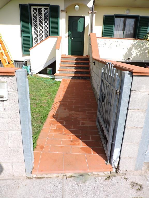 L' abitazione è disposta al piano terrra rialzato, l'accesso é tramite gradevole giardino di proprietà destinabile anche a posto auto. La disposizione degli ambienti comprende un moderno open space organizzato ingresso in soggiorno e cucina abitabile, con arredo rinnovato e con, a sua volta, uscita sul giardino posteriore particolarmente indicato per cene estive.