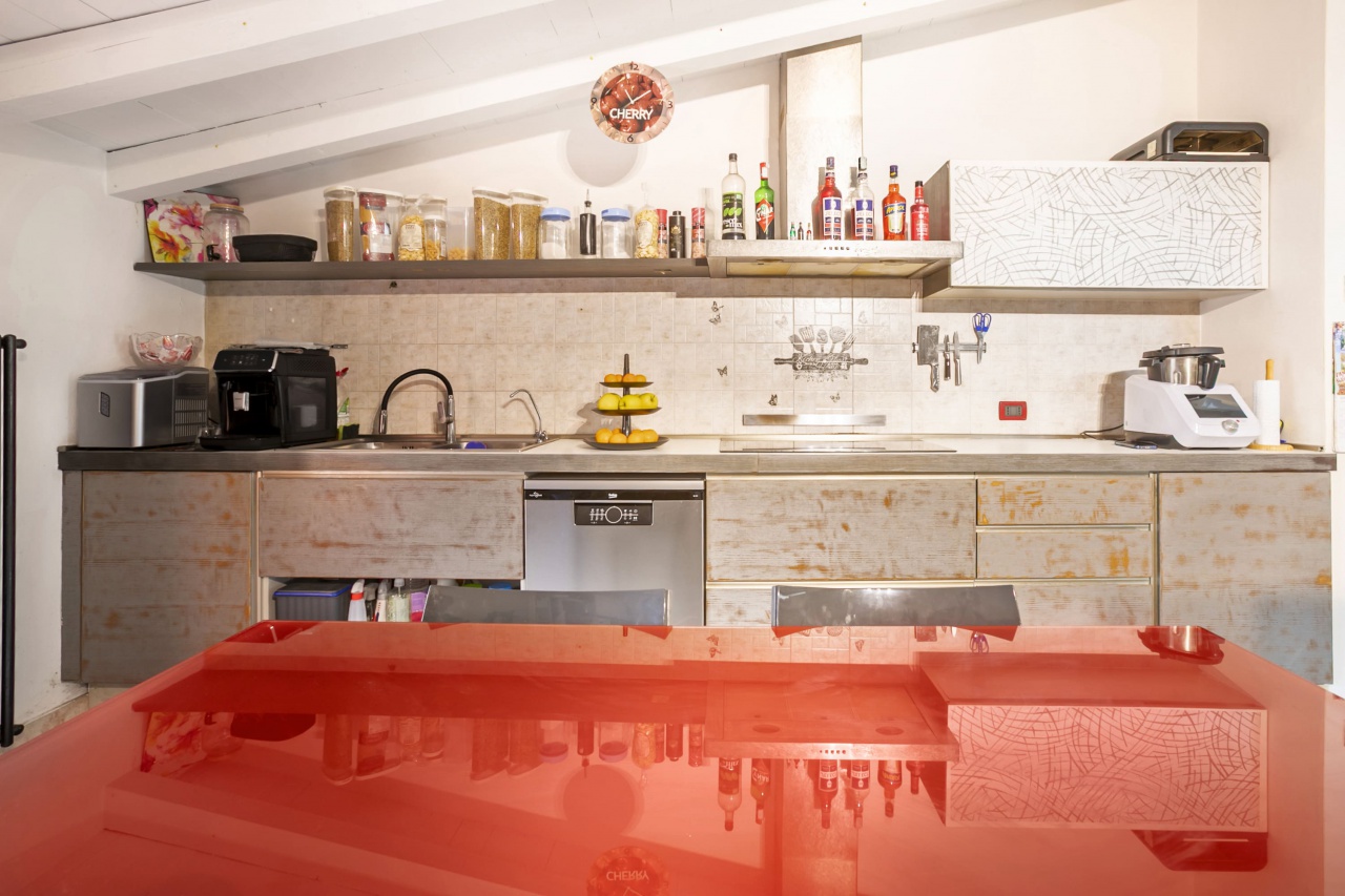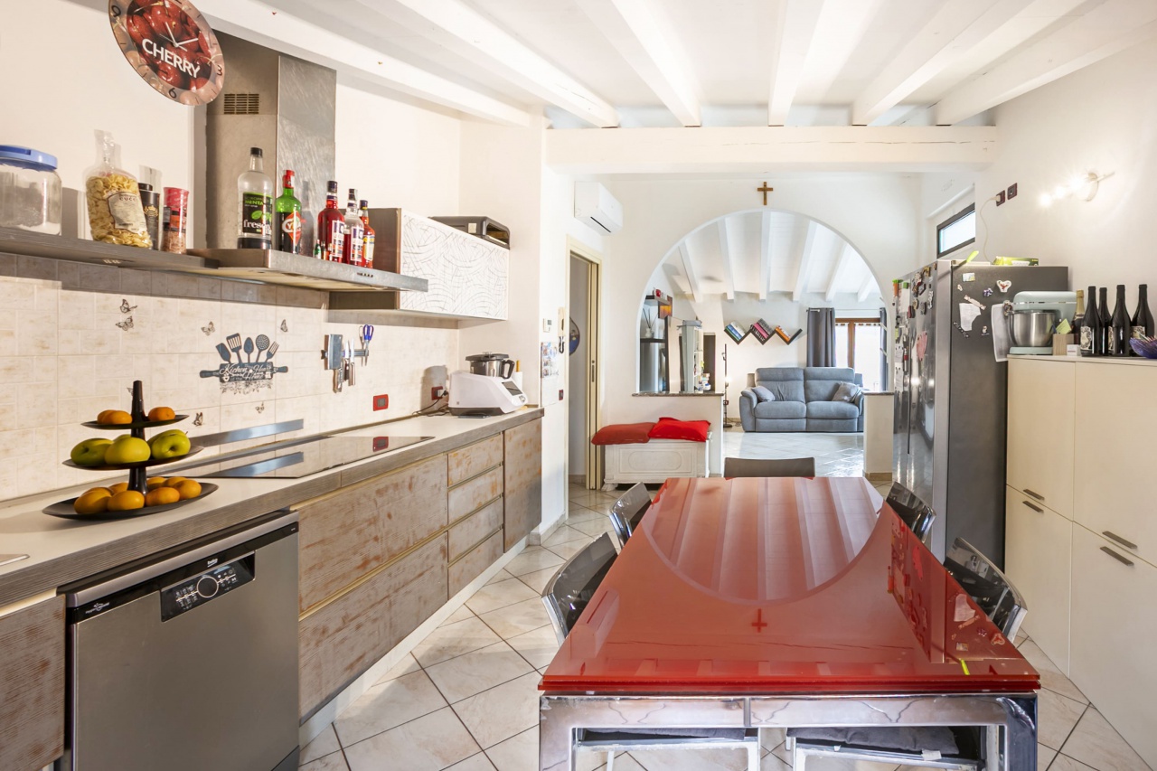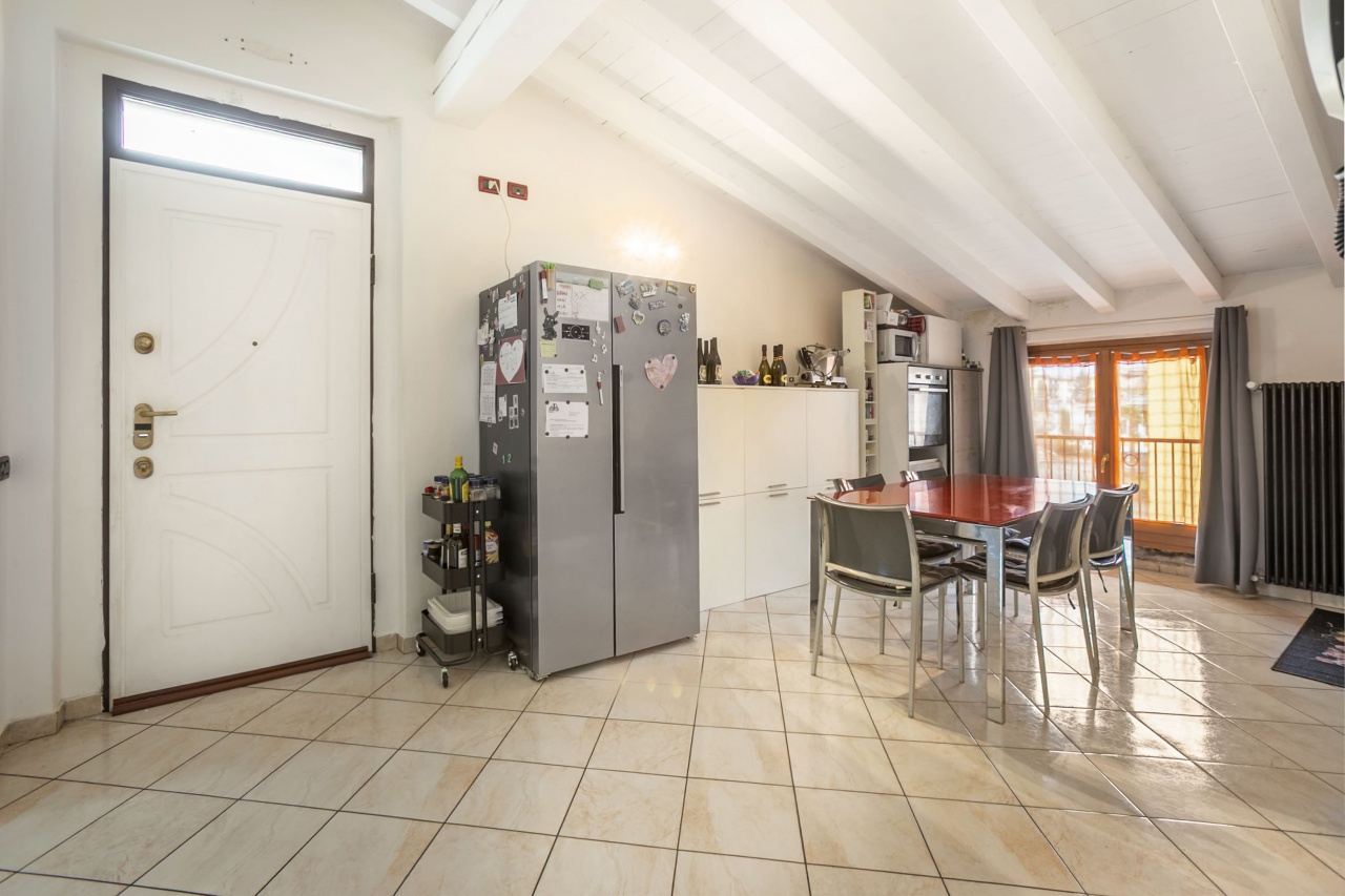 La zona giorno mansardata con travi a vista sbiancate dona un'atmosfera moderna e accogliente, con soggiorno ampio e cucina semi-separata.