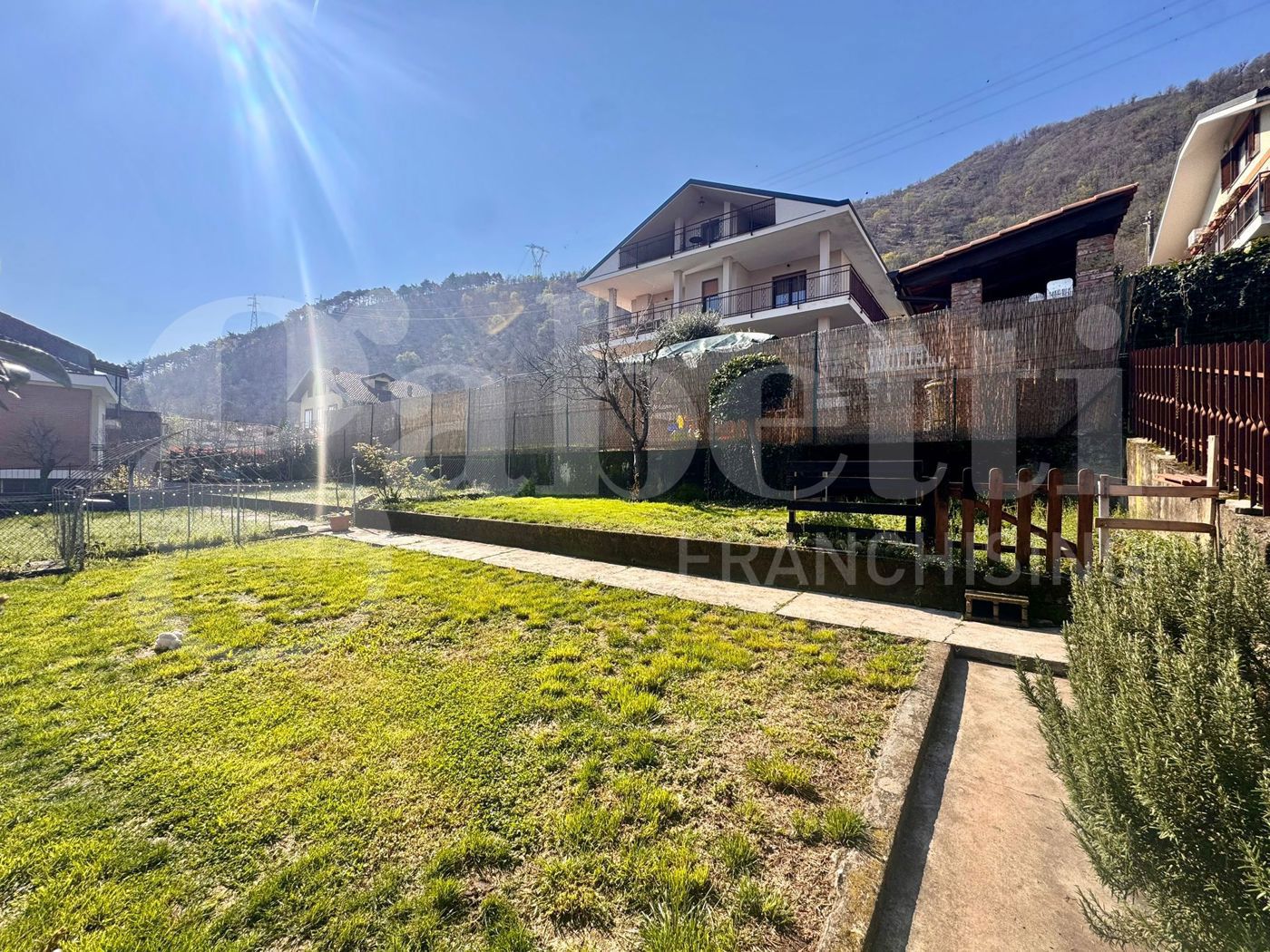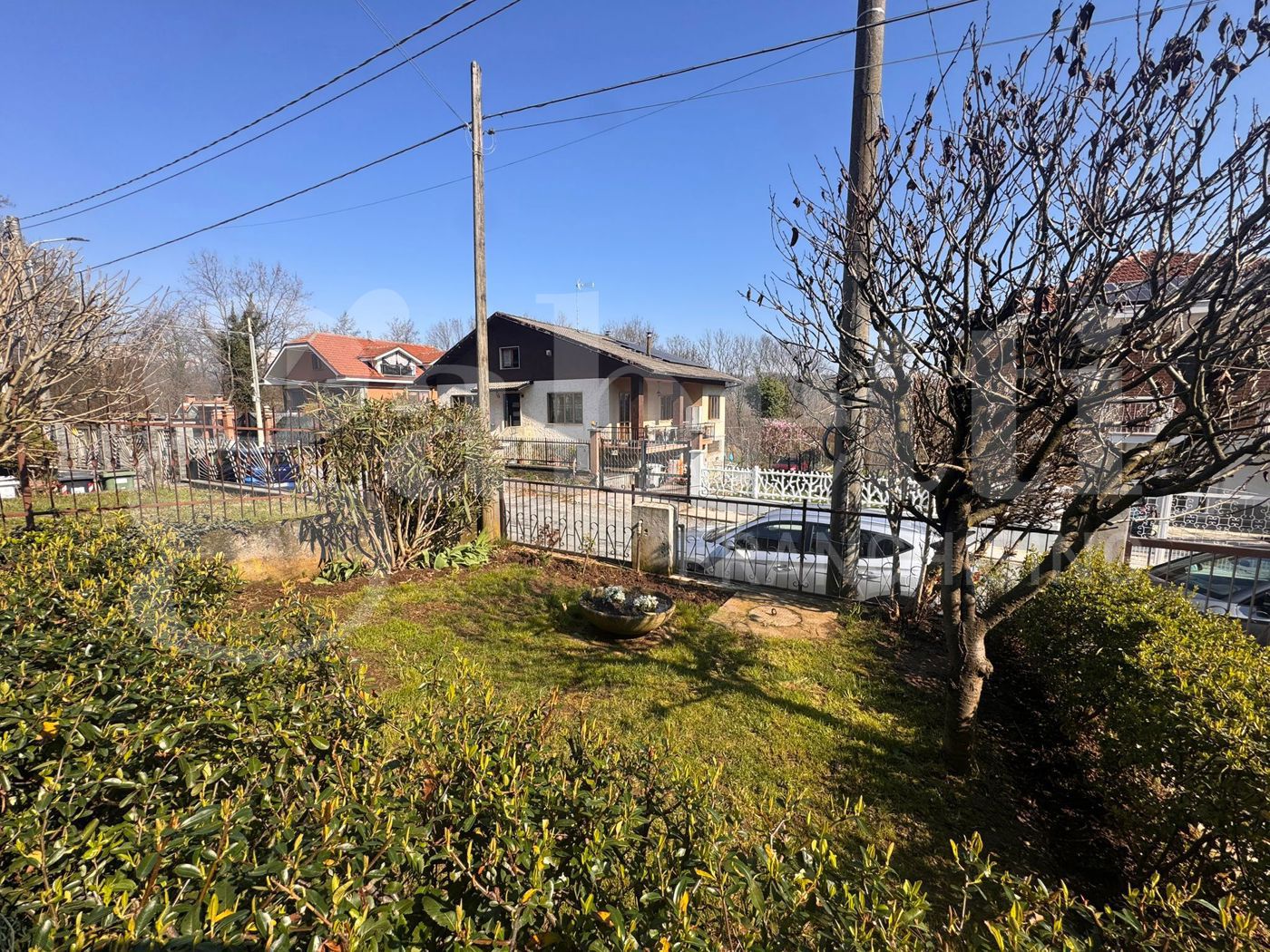 Piano terreno: ingresso, box auto, cantina, lavanderia e centrale termica; Piano primo: ingresso, soggiorno doppio con uscita su giardino di propriet, cucina abitabile a vista, servizio e balcone; Piano secondo mansardato (con abitabilit): disimpegno, due camere (di cui una con balcone) ed ampio servizio con doccia e vasca). Giardino su due lati angolari e cortile su fronte.