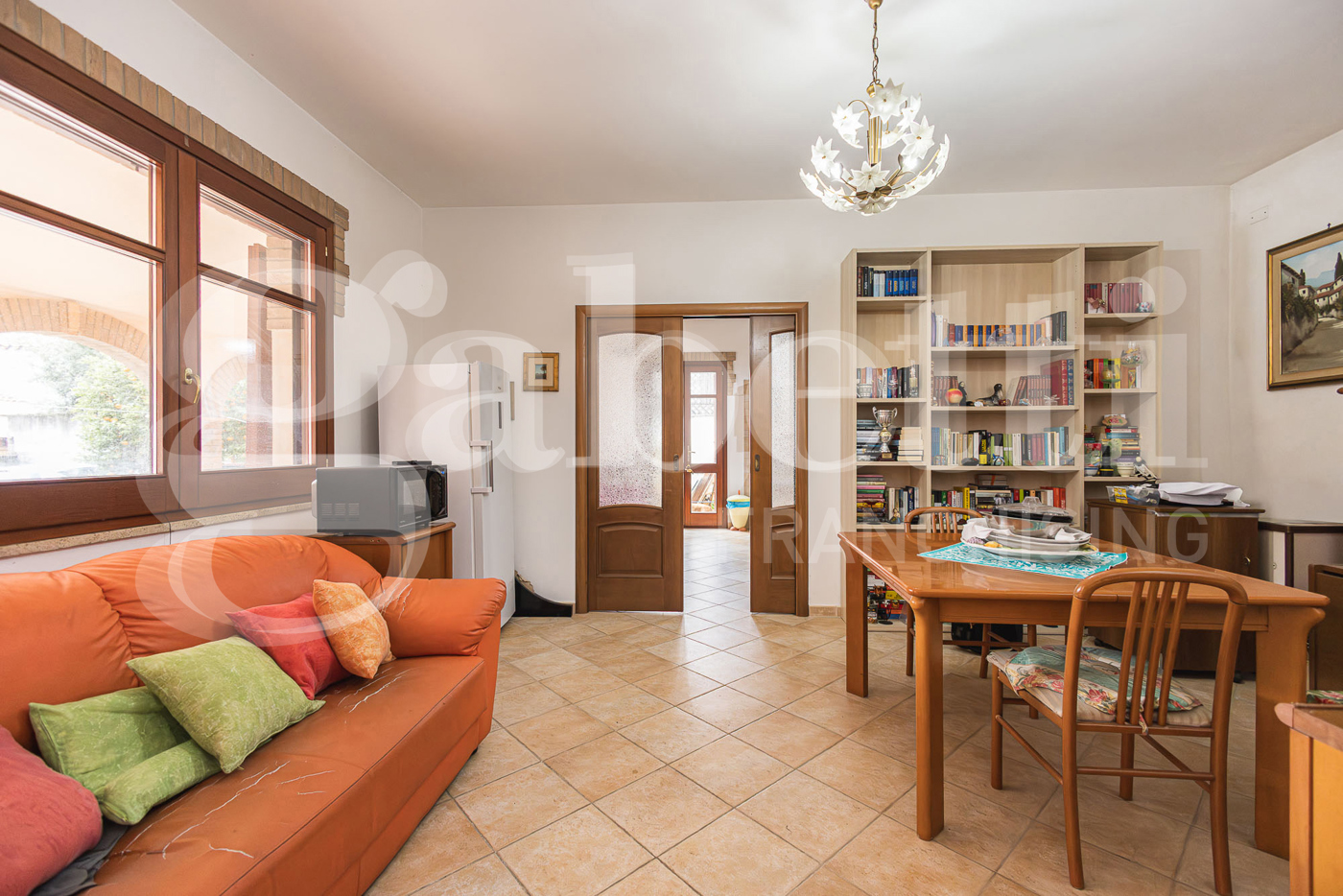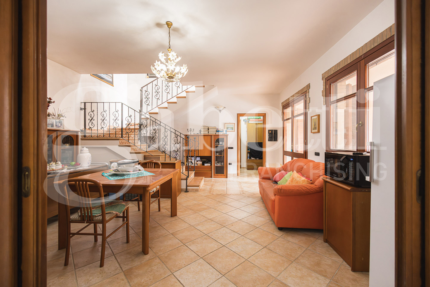 L'immobile cosi composto: -piano terra ampio cortile di circa 350 mq, loggiato d'ingresso di 30 mq, soggiorno, cucina abitabile con camino, disimpegno, bagno, camera matrimoniale di oltre 19 mq, garage coperto di 13 mq; - piano primo una camera matrimoniale, due singole, bagno e un ripostiglio che da accesso al soppalco in legno realizzato sopra la cucina.