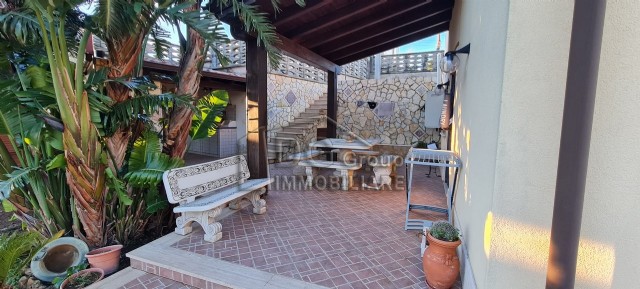 \nDa una scala interna rifinita in marmo, ci accoglie nel piano superiore, dove troveremo la zona notte, composta da tre camere da letto, di cui due singole e una bellissima camera matrimoniale molto elegante, tutte le camere sono dotate di finestre , che offrono una vista panoramica sulle cime imponenti della montagna di Alcamo.\nil bagno con vasca rifinito con materiali di alta qualità. \nConclude questa incantevole villa, un bellissimo giardino all'esterno curato nei minimi dettagli, una cucina rustica, dotata di forno, in modo da poter trascorrere delle bellissime serate estive, in compagnia di amici e parenti.\nInoltre la casa è fornita di riscaldamento autonomo, condizionatori e un comodo garage.