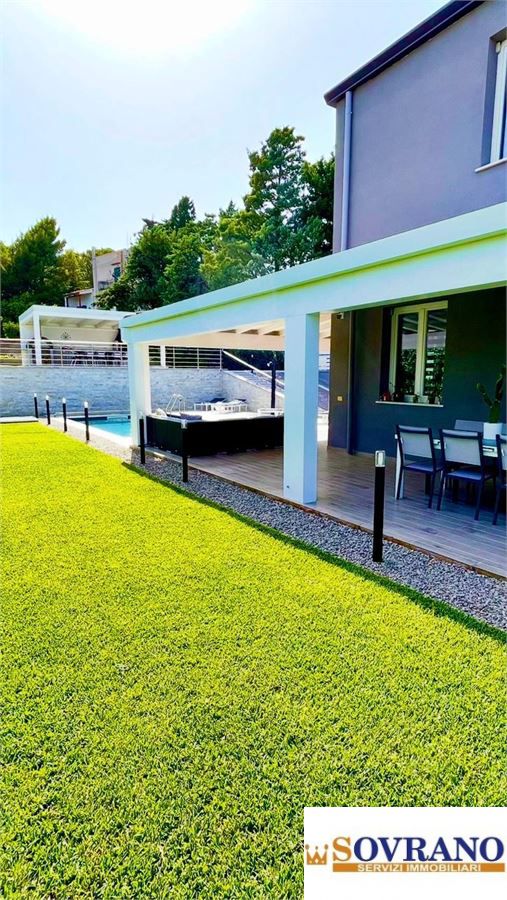 La sicurezza è assicurata da impianto di allarme con sensori esterni lungo tutta la facciata e da un sistema di videosorveglianza con 11 telecamere gestibili da remoto tramite applicazione e Wi-Fi. All'esterno, la proprietà offre spazi curati e scenografici: un giardino armonioso con prato, siepi e piante ornamentali servito da impianto di irrigazione, una piscina ad acqua salata con gestione automatizzata e minima manutenzione, e una raffinata area gazebo con cucina esterna completa di forno a legna professionale, barbecue e frigorifero.