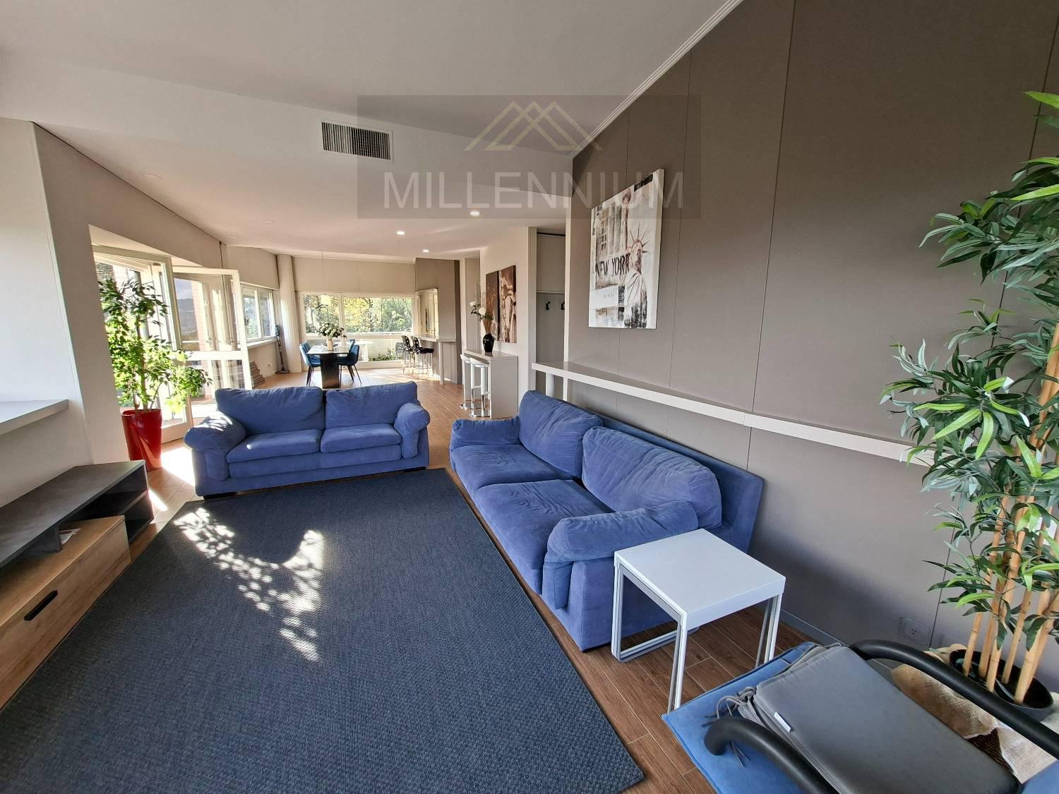 Composizione interna: Grande soggiorno con vetrate affacciate sul verde; cucina open space in stile vintage; tre camere da letto e due bagni.