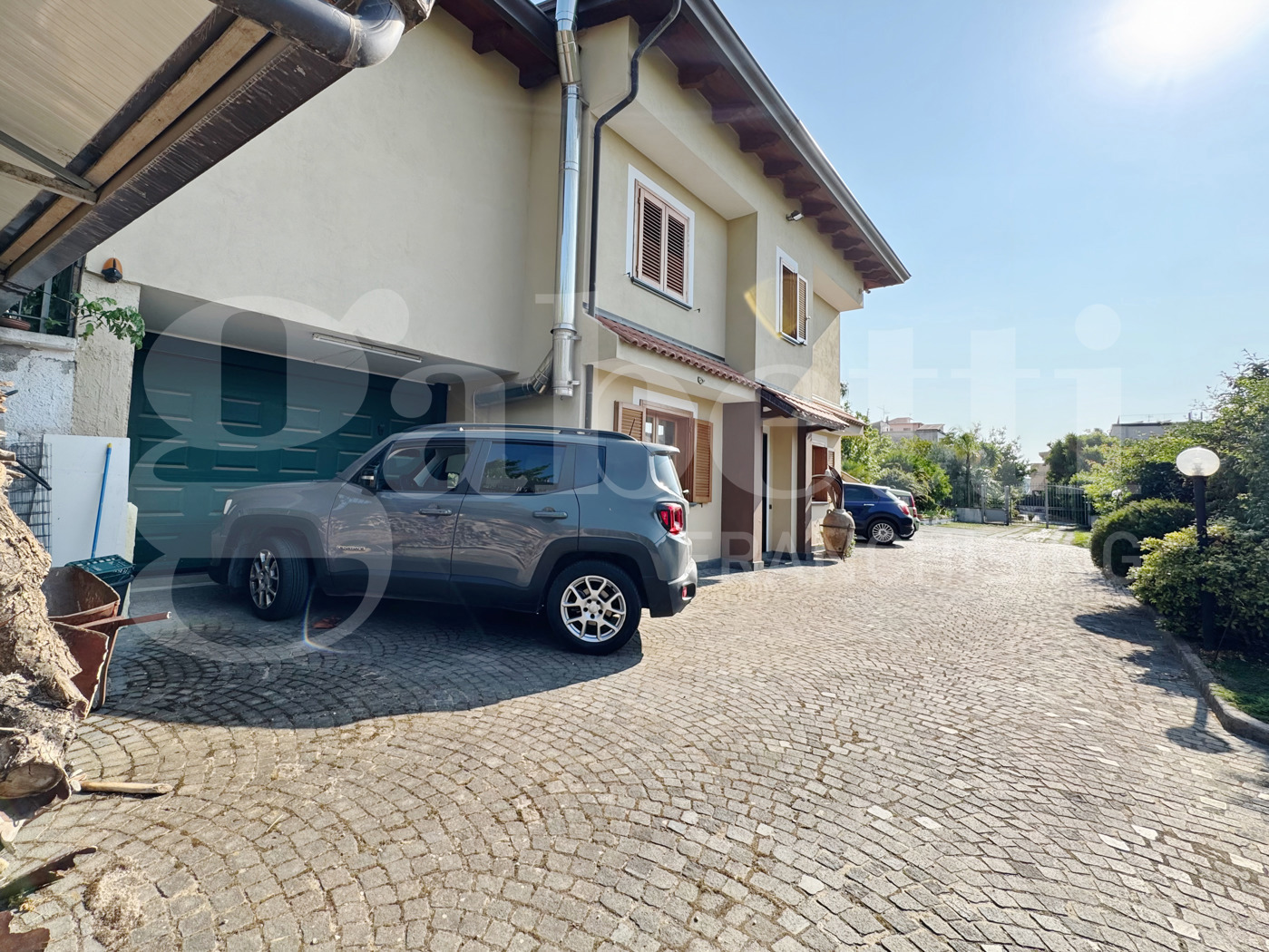 Allesterno, la villa si circonda di verde: un ampio giardino con alberi da frutto, una piscina interrata con solarium, un patio coperto ideale per pranzi allaperto e una zona di ingresso pavimentata per il parcheggio.